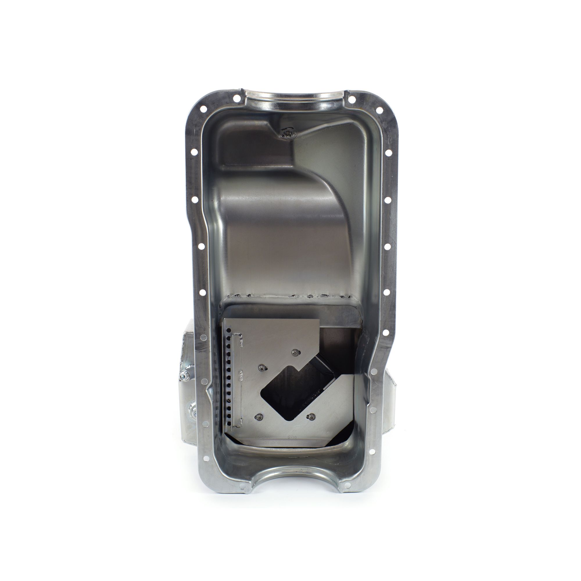 This "T" style rear sump oil pan is for Ford 289-302 blocks with main supports in Fox Body Mustangs. It has a 7-1/2" deep by 8" long by 13-1/2" wide sump and a 7 quart system capacity. Crank scraper omitted to allow for clearance for most main supports. This pan requires a 15-647 pickup for use with Canton #21-060 main support. Some long tube headers require modification. Note: Modification needed for manual transmission 94-95 Mustangs for clutch cable clearance.
