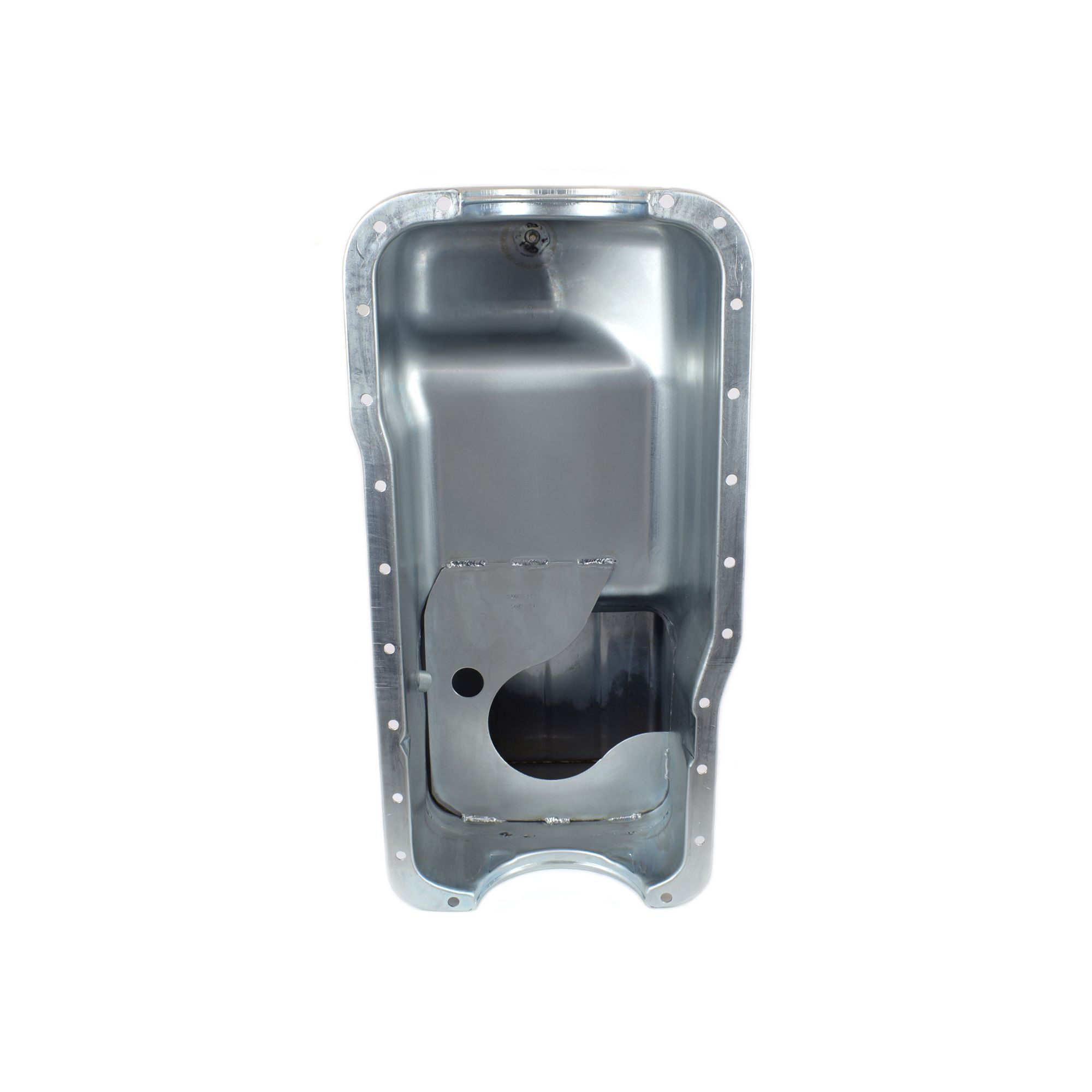 This deep rear sump oil pan is for Ford 351 Windsor blocks with main supports. It has a 9" deep by 7" long sump and a 7 quart system capacity. Crank scraper omitted allows clearance for most main supports. This pan requires one of our pickups.