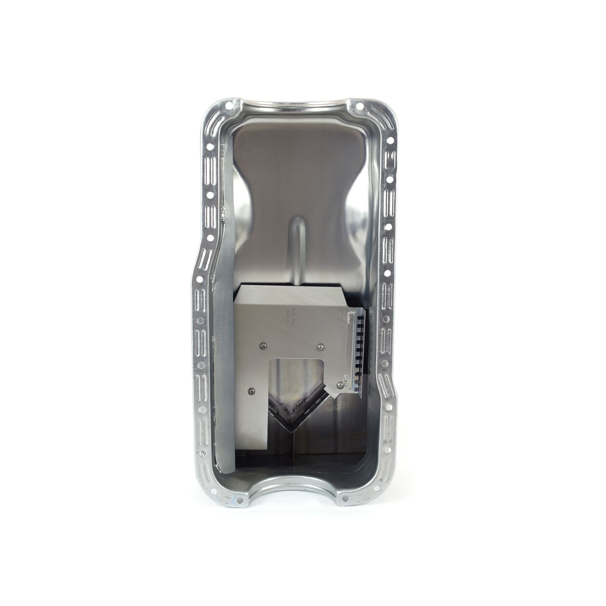 This front sump road race pan is for Ford 351 Windsor blocks. It has a 9 qt. system capacity, 8" deep, 12" wide, 14 ga. sump designed with 14 gauge steel for Cobra kit cars. Will work with stock & aftermarket starters. This pan requires our 15-661 pickup.