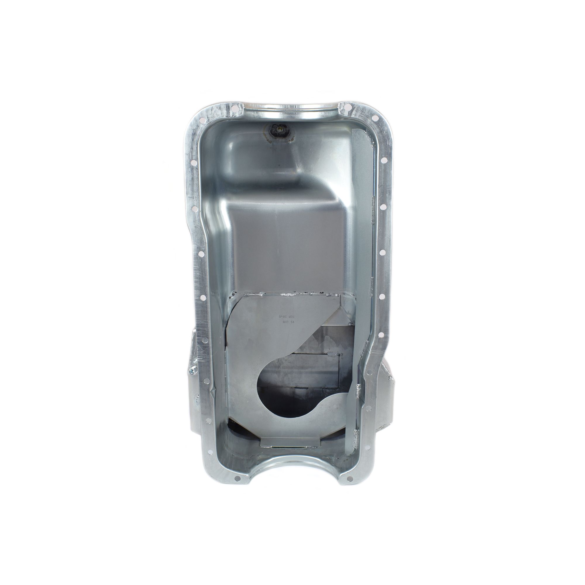 This "T" style rear sump oil pan is for Ford 351 Windsor blocks in Fox Body Mustangs. It has a 7-1/2" deep by 8" long by 13-1/2" wide sump and a 7 quart system capacity. Some long tube headers require modification. This pan requires our 15-691 pickup. Note: Modification needed for manual transmission 94-95 Mustangs for clutch cable clearance.