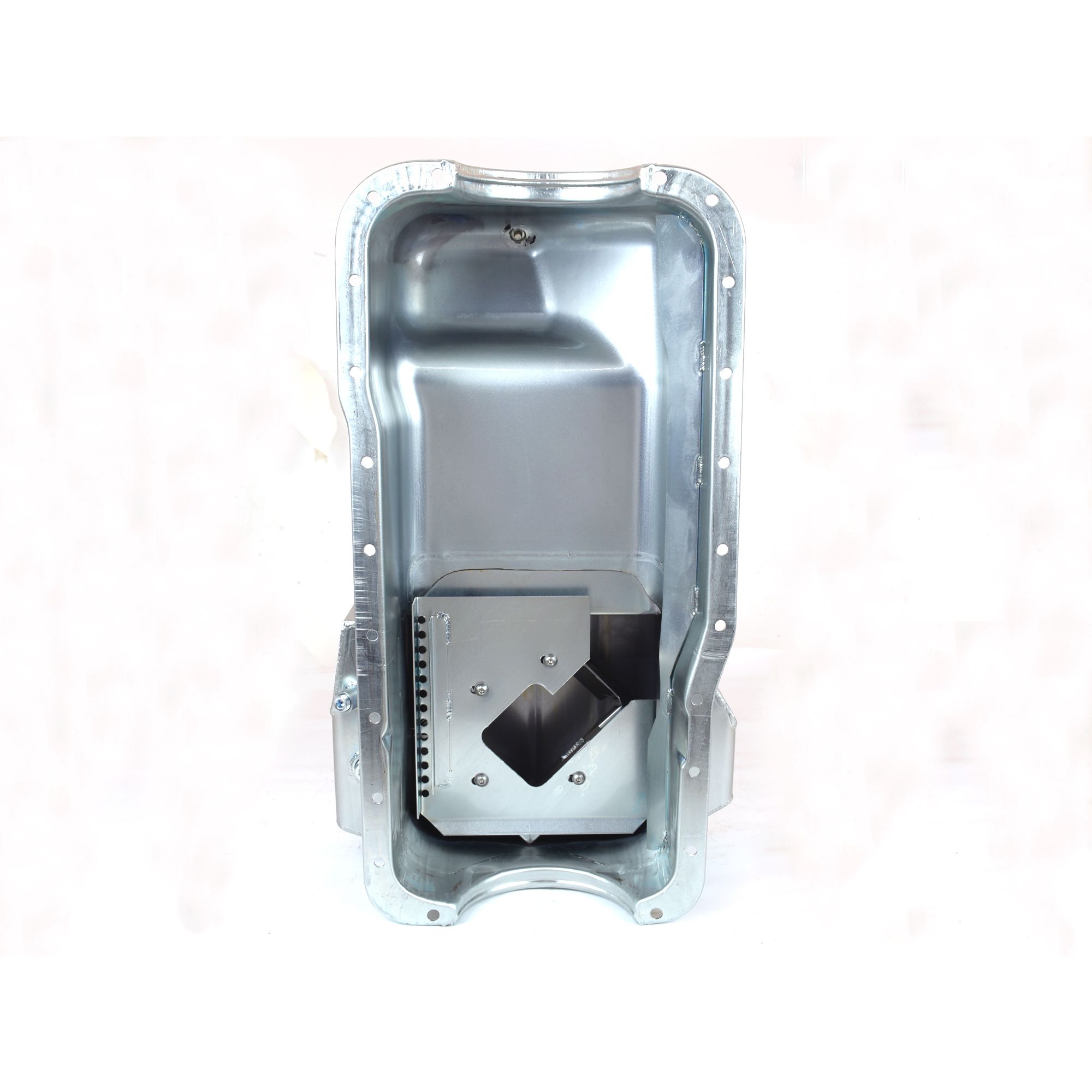 This "T" style rear sump oil pan is for Ford 351W blocks in Fox Body Mustangs. It has a 7-1/2" deep by 8" long by 13-1/2" wide sump and a 7 quart system capacity. Some long tube headers require modification. This pan requires our 15-695 pickup. Note: Modification needed for manual transmission 94-95 Mustangs for clutch cable clearance.