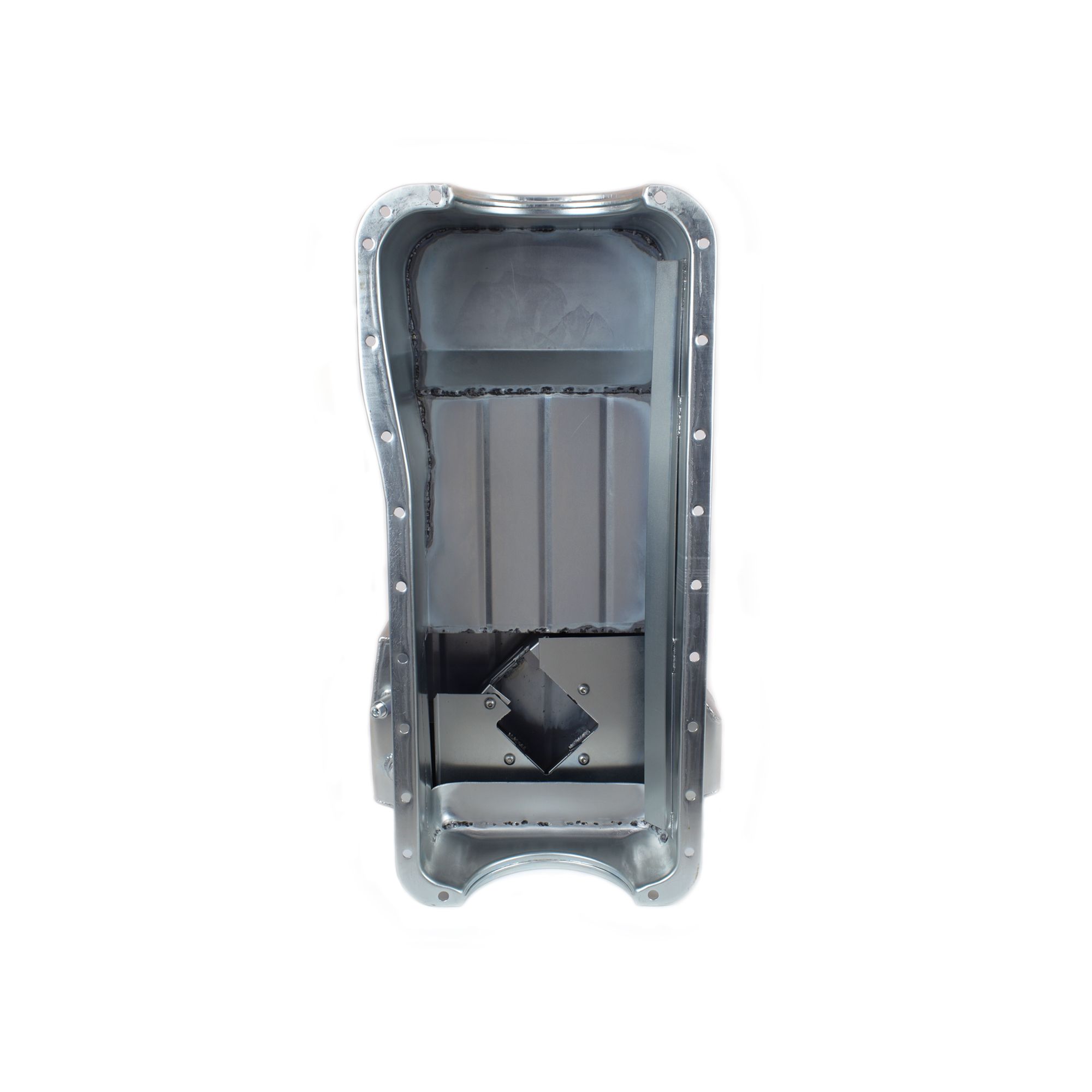 This ?T? style rear sump road race baffled oil pan is designed for Ford 429-460 engines in ?79 and up Mustangs and other rear sump applications, such as Cobra Kits. It has a 7-1/2" deep by 8" long by 13-1/2" wide sump with a 7 quart system capacity. This pan requires our 15-775 pickup & M84DHV Oil pump.