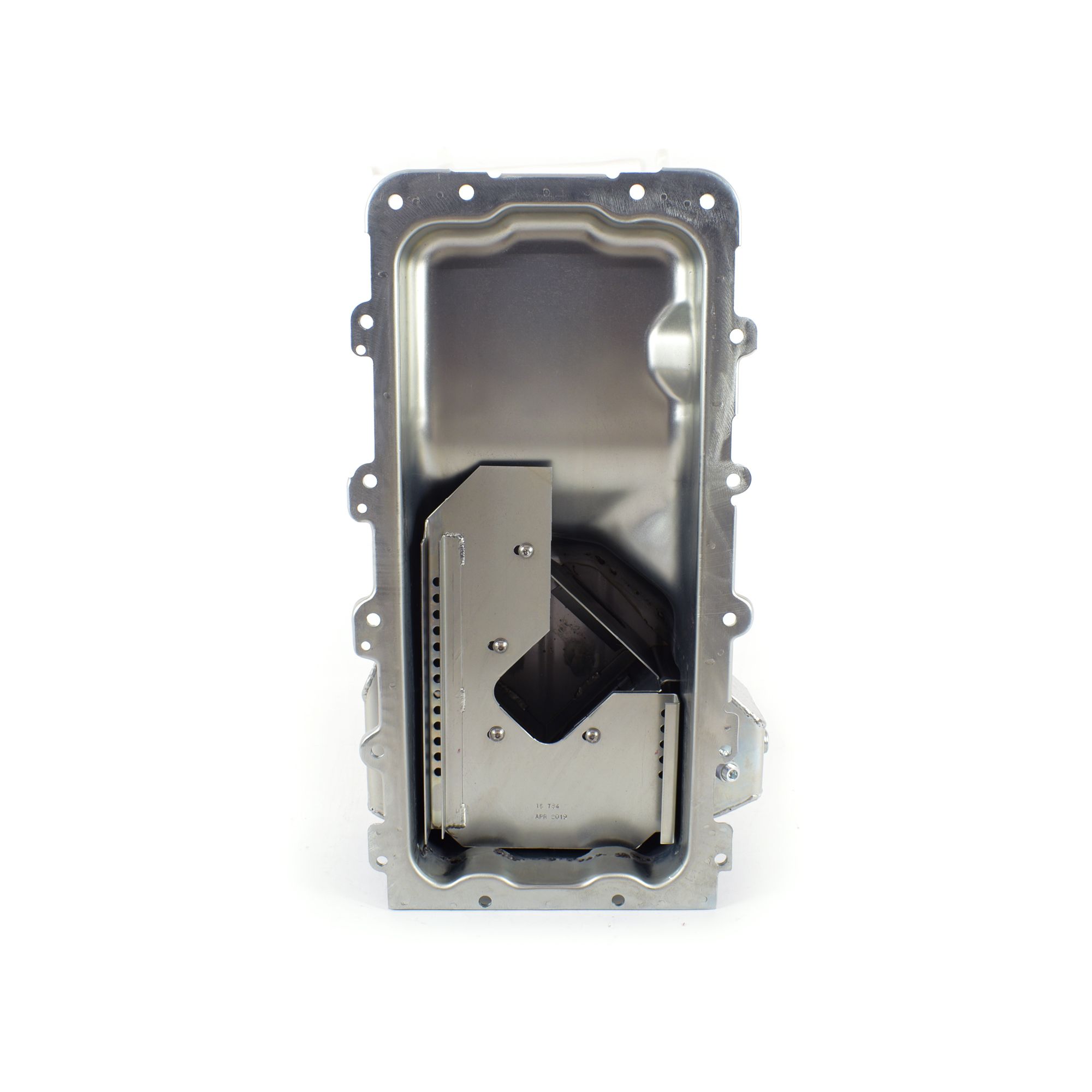 This ?T? style modular rear sump road race oil pan is designed for Ford 4.6L/5.4L blocks in ?96-?04 & ?05-up Mustangs. It has 6-1/4" deep, 12-3/4" wide by 9-1/4" long sump and a 7 quart system capacity. Use Your OEM pickup for this pan.