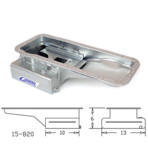 This front sump Ford 332-428FE road race pan is ideal for Mustangs or Cobra Kit Cars. It has a 6" deep, 13" wide by 10" long sump for an 8 quart system capacity. "T" style sump to increase capacity without losing ground clearance. This pan requires our 15-821 pickup for Melling oil pump M57HV.