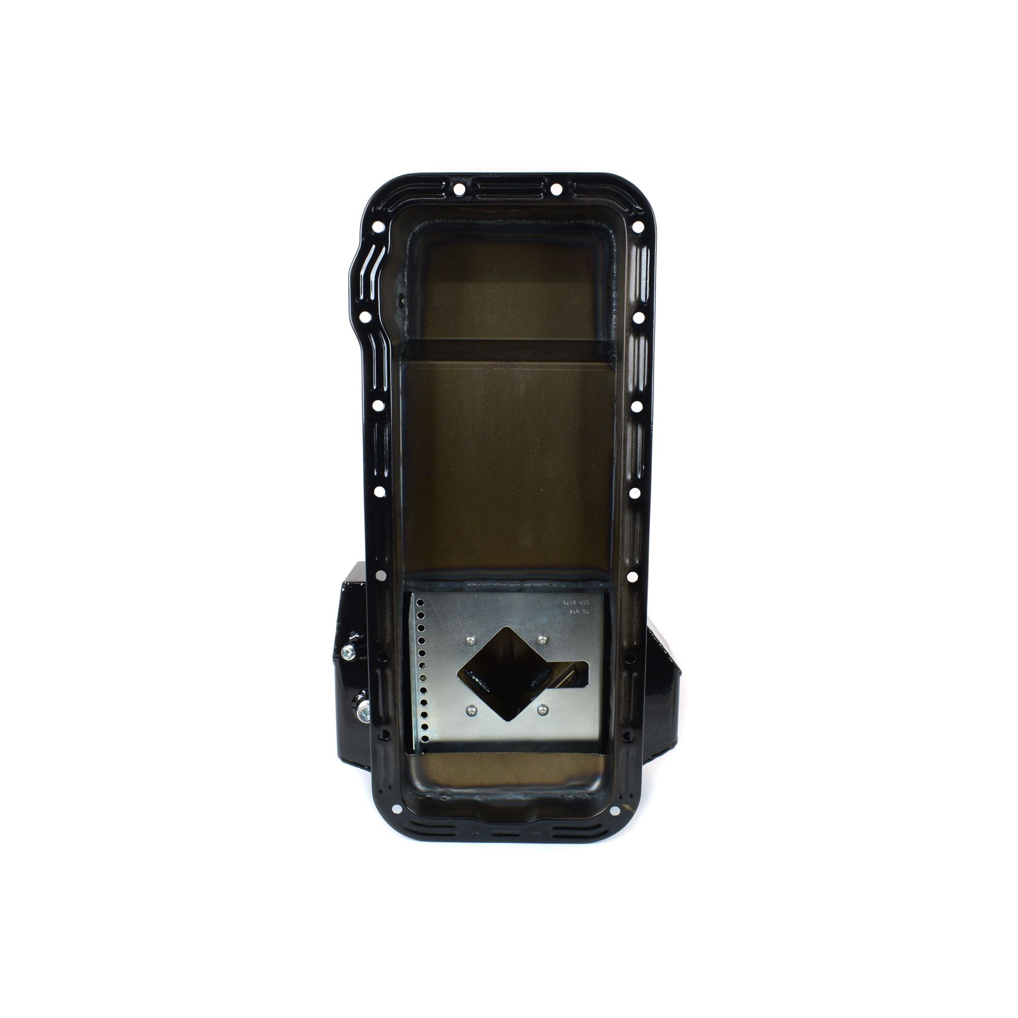 This "T" style Ford 332-428 FE rear sump black powdercoated oil pan is is designed for early Mustangs with Rack and Pinion conversion front ends installed, or 79 to 93 Mustang, 80-97 T-Birds, or Rear Sump Cobra Kit Cars. It has a 6? deep, 13? wide by 8? long sump with a 7 quart system capacity. This pan requires our 15-875 pickup.
