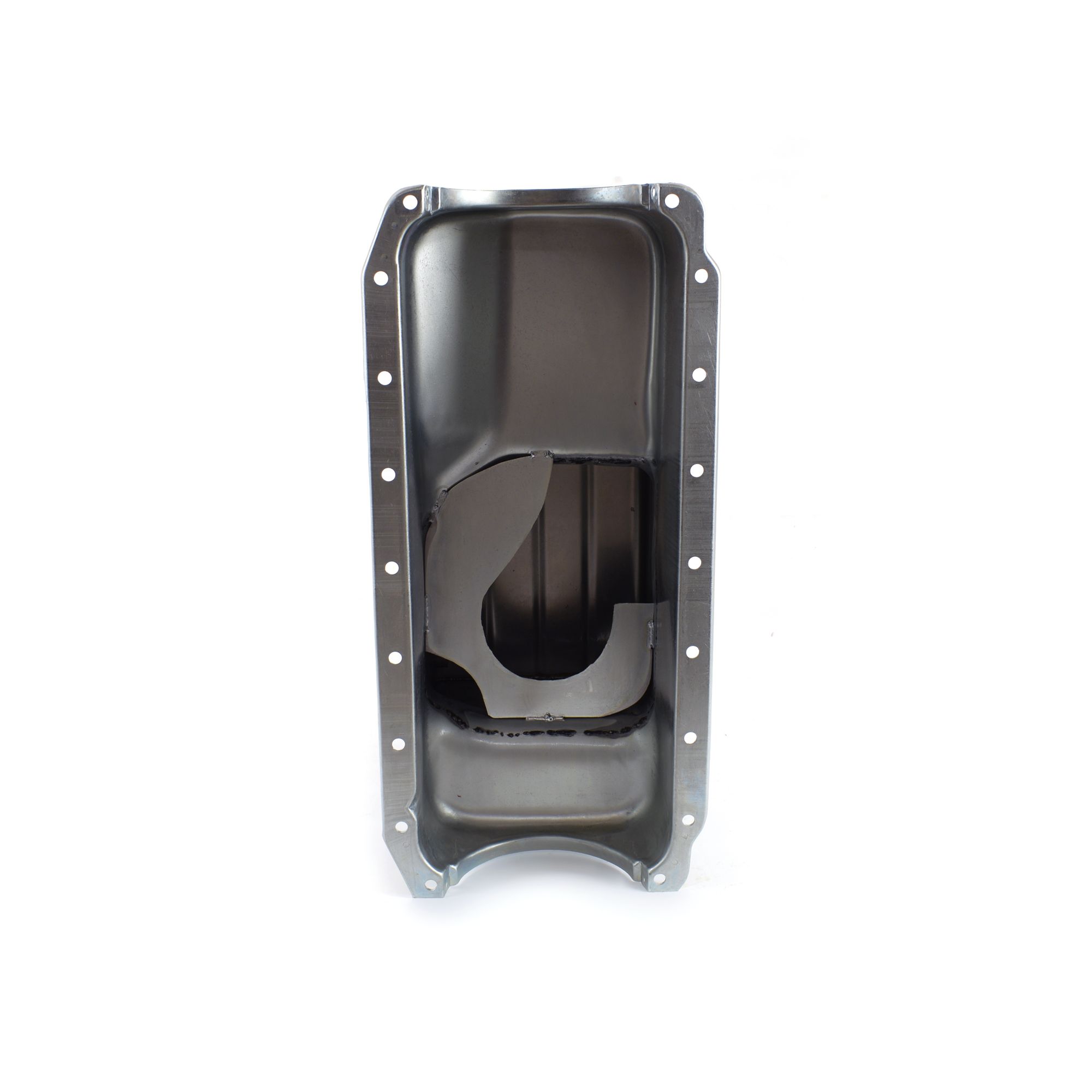 This street / strip oil pan for SM. Block Chrysler engines 273, 318, & 340, fits most production chassis. It features a deep sump and built in slosh baffle for oil control and a magnetic drain plug. Sump is 9? deep and provides a 7-quart system capacity.