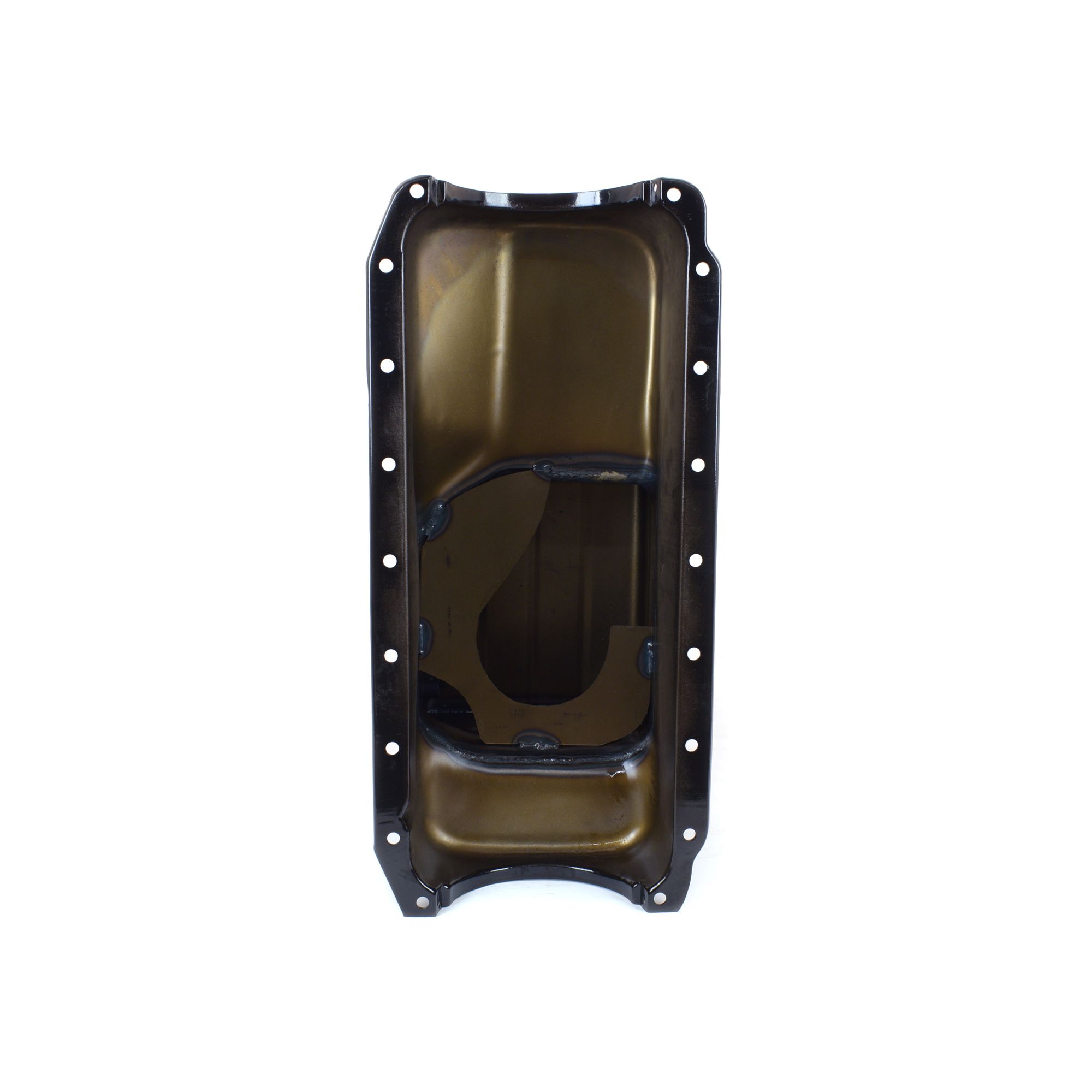 This black powdercoat street / strip oil pan for SM. Block Chrysler engines 273, 318, & 340, fits most production chassis. It features a deep sump and built in slosh baffle for oil control and a magnetic drain plug. Sump is 9? deep and provides a 7-quart system capacity.