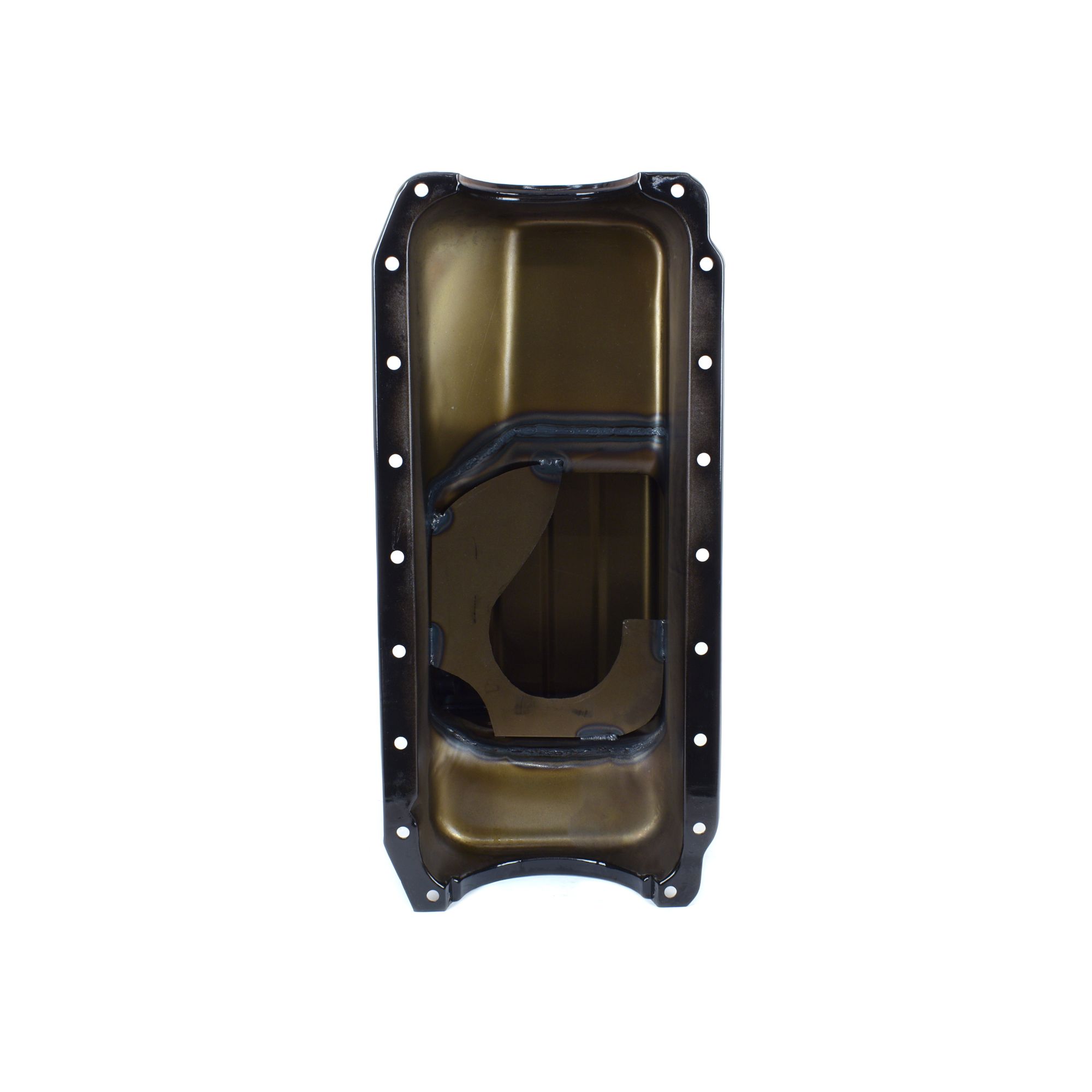 This black powdercoat street / strip oil pan for SM. Block Chrysler 360 engines fits most production chassis. It features a deep sump and built in slosh baffle for oil control and a magnetic drain plug. Sump is 9" deep and provides a 7-quart system capacity.