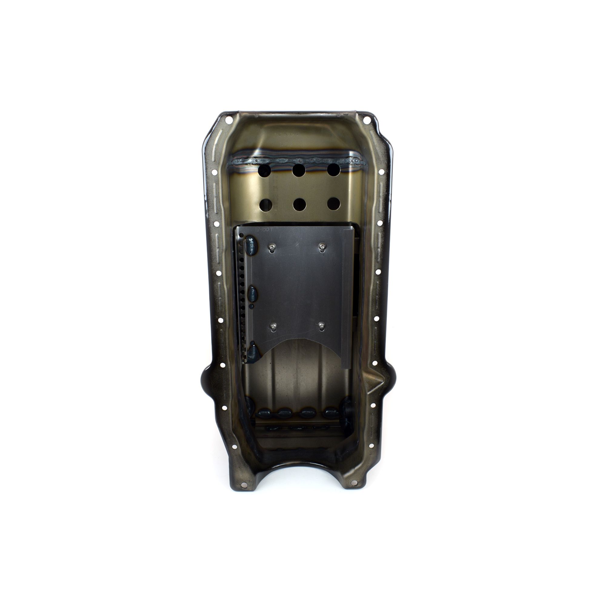 This SBC High Capacity Marine Pan is for '86 and newer blocks with a one piece seal. With a deep 7-1/2" full length sump it holds 8 quarts of oil for greater oil capacity. Designed for applications with the pickup at the flywheel end of the engine. This pan requires our #18-101 pickup.