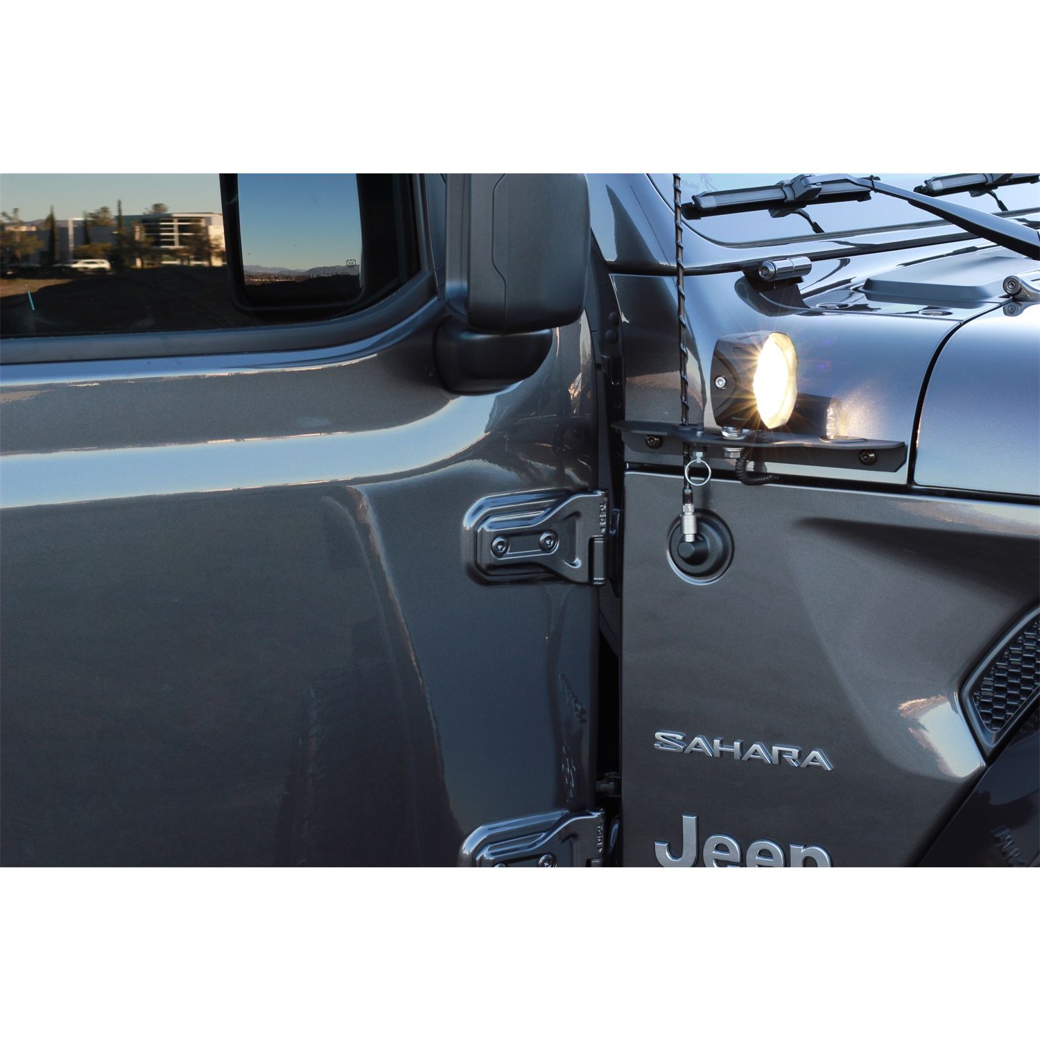 The JL 180 Light Mount is designed for effortless 180 degree light rotation on the driver and passenger side of a JL Wrangler. It solidly mounts onto the two side A-Pillar factory holes and can accommodate 3 inch lights. With a pull pin design, it can be rotated to 7 different positions without using any tools, making it perfect for on the fly adjustments.