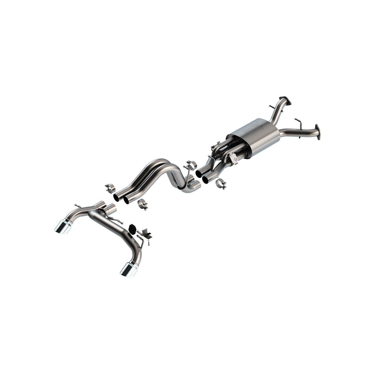 his 2.75" diameter system was designed specifically for the Bronco Raptor R 3.0L V6 Twin Turbo. The system features Active Exhaust Valves. Muffler contains an Internal H-Pipe for increased performance and improved sound. The system provides the aggressive ATAK® sound. BORLA®'s advanced muffler technology delivers great sound outside the vehicle with no drone or resonance inside the vehicle. It features single 4" round bright chrome on T-304 stainless steel tips on each tail pipe. A system with black coated T-304 stainless steel tips are also available. BORLA® Cat-Back™ exhaust systems feature patented straight-through and multi-core technology to unleash hidden horsepower. Increased exhaust velocity adds power, driving excitement, fuel economy, and the distinctive BORLA® Sound of Power respected by motoring enthusiasts everywhere. Each system is built from premium T-304 stainless steel, superior to T-400 series knockoffs (such as 409), to give you the absolute best in performance and durability. Ultra-smooth mandrel bends ensure maximum flow & power, and precision computer numerical control (CNC) manufacturing ensures an accurate fit. Best of all, BORLA® stands behind every system with a Million-Mile Warranty. Just what you'd expect from the world's most experienced (and most winning) exhaust brand.