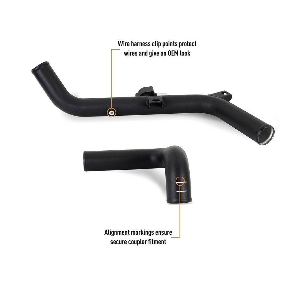TechSpec Includes: (1) Aluminum Pipe w/ CNC-machined quick-disconnect–(1) Aluminum Pipe w/ CNC-machined 2-bolt flange–(1) Quick-Disconnect Spring Clip–(1) 2.25-in to 2.5-in Silicone Transition Coupler–(1) 2.5-in T-bolt Clamp–(1) 2.75-ft T-Bolt Clamp–Mishimoto Lifetime Warranty