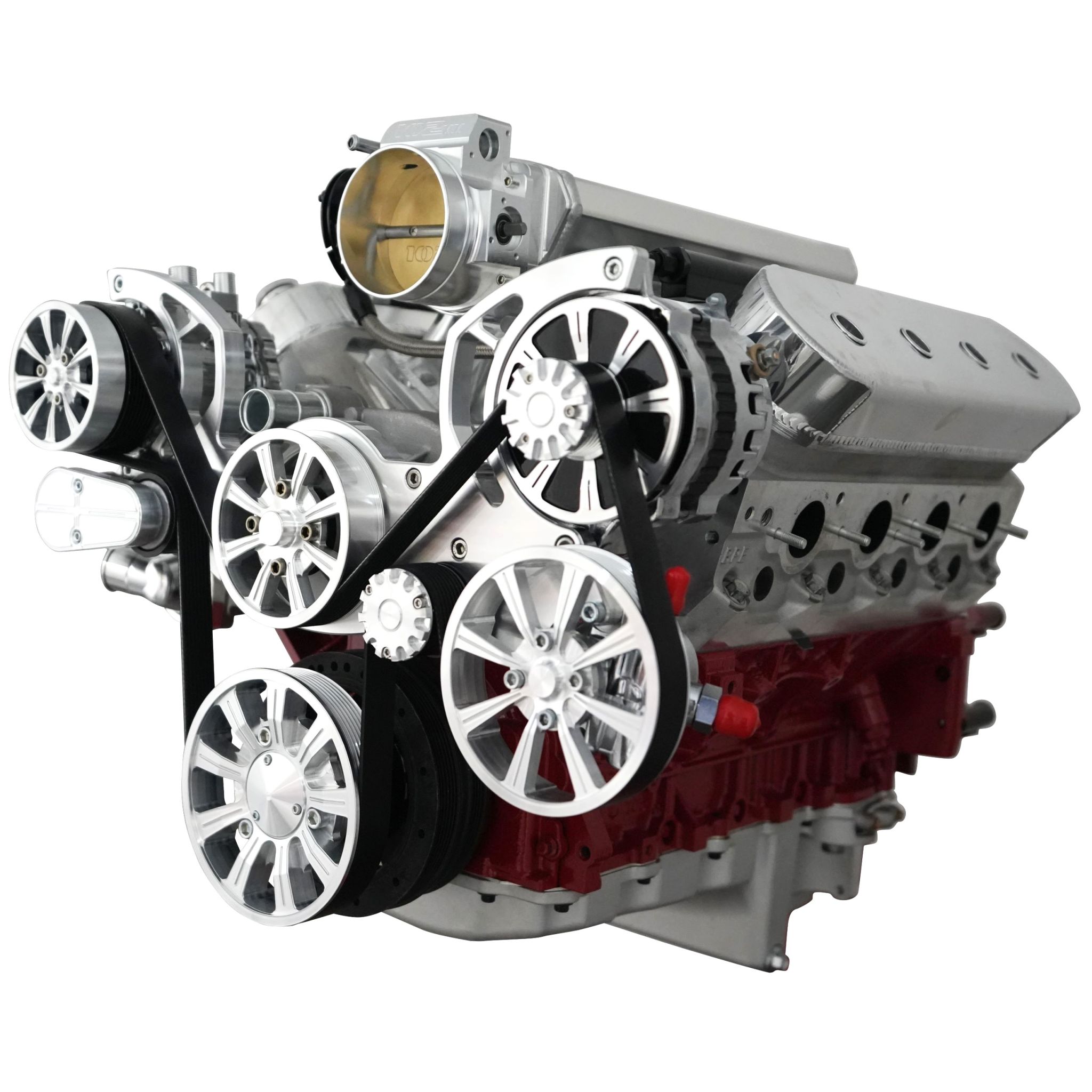 Chevy LS All Inclusive Evolution Serpentine System w/ AC, PS & ALT. Clear Powder Coat Finish. Stainless Hardware. Anodized Spacers. Camaro/Truck balancer.