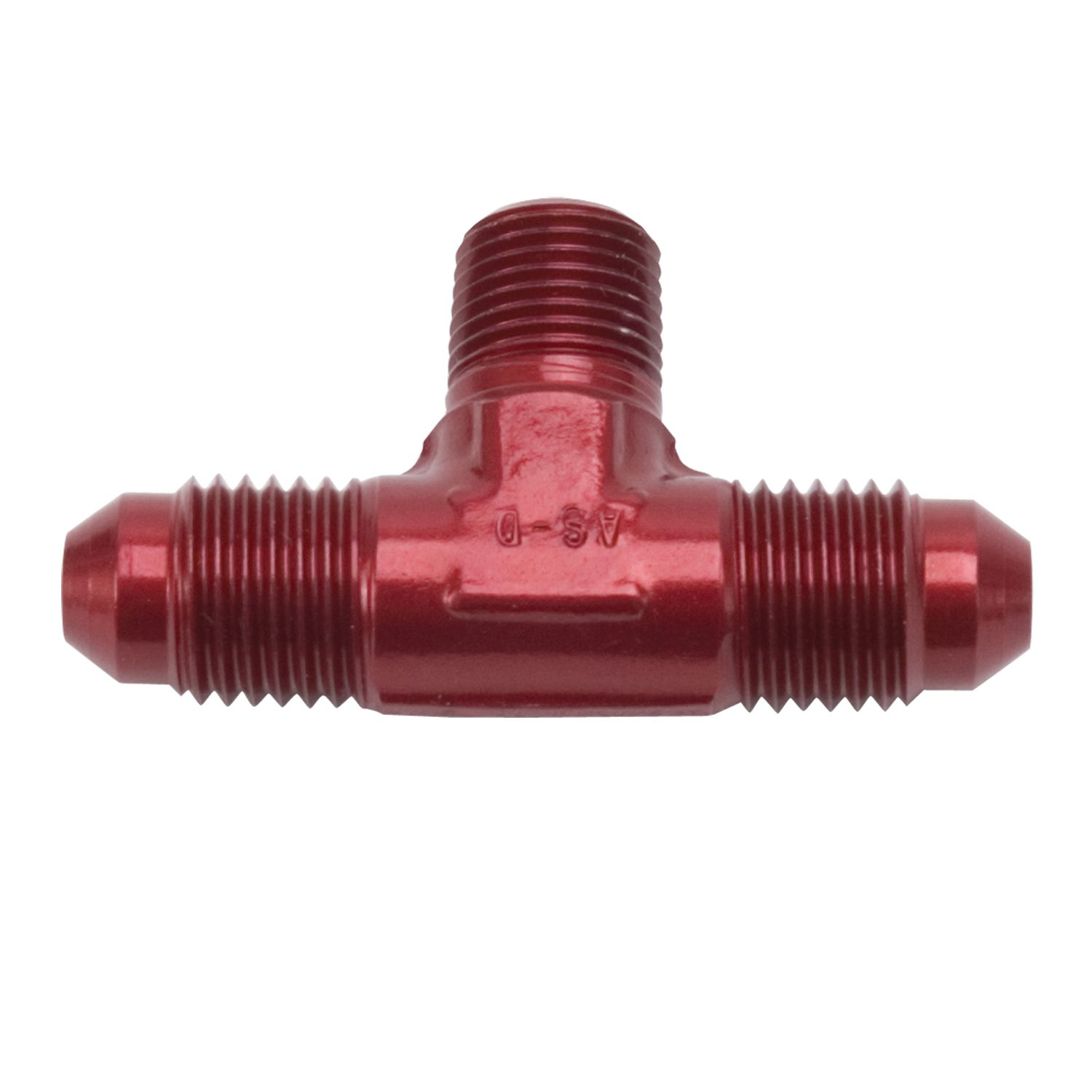 Edelbrock part #76548 Flare to Pipe T fitting features a 4 AN – 4 AN – 1/8" NPT ends with red anodized finish. Use the AN size that matches your hose and the NPT (National Pipe Thread) size that matches the component you are plumbing.