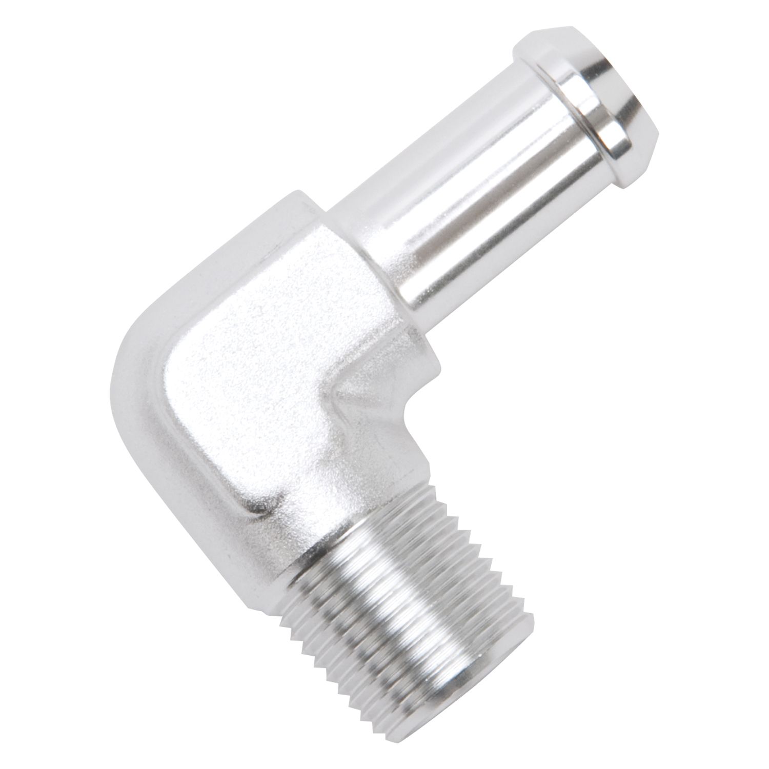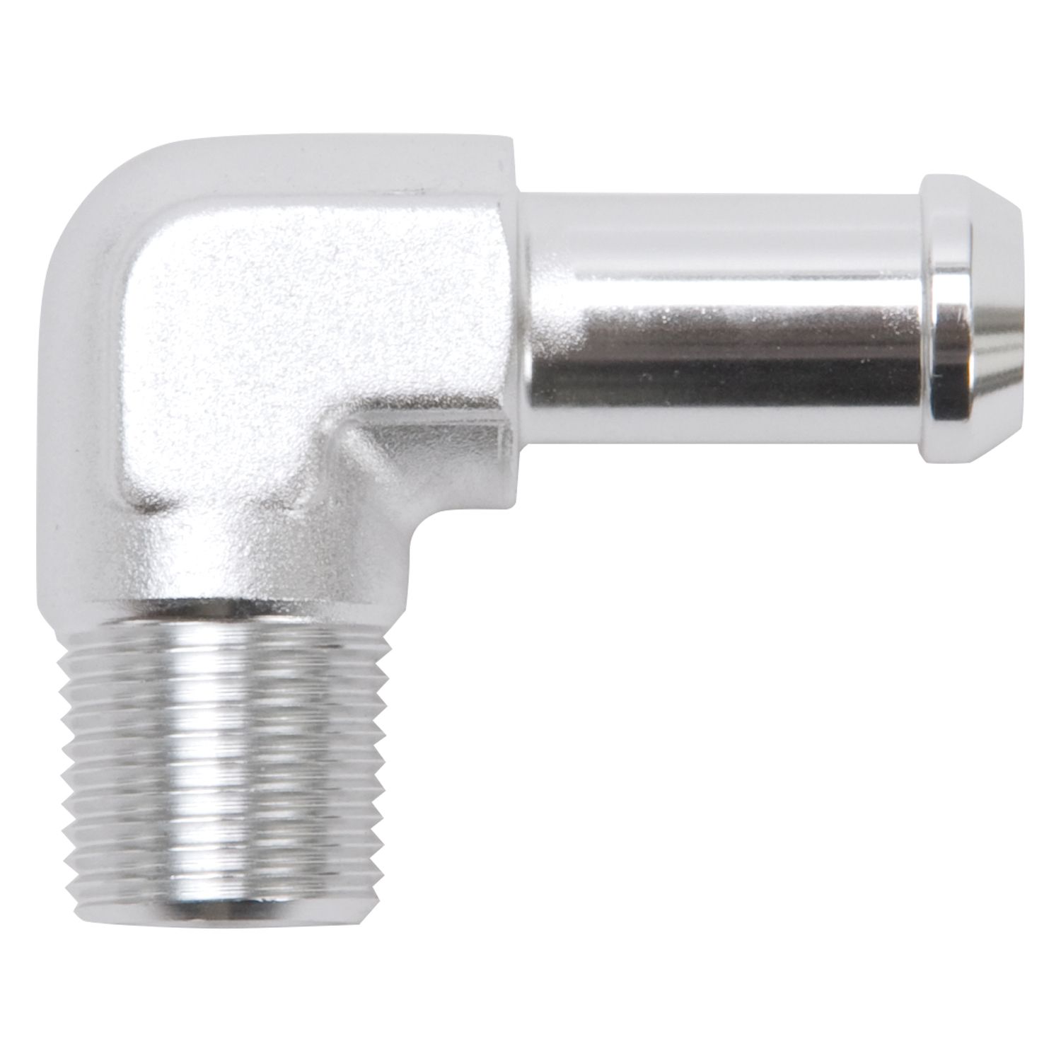 Edelbrock part #8164 Heater Hose End Fitting, 90 deg. with 3/8" NPT and 1/2" Barb. Edelbrock heater hose end is designed to hold up to any plumbing task you have.