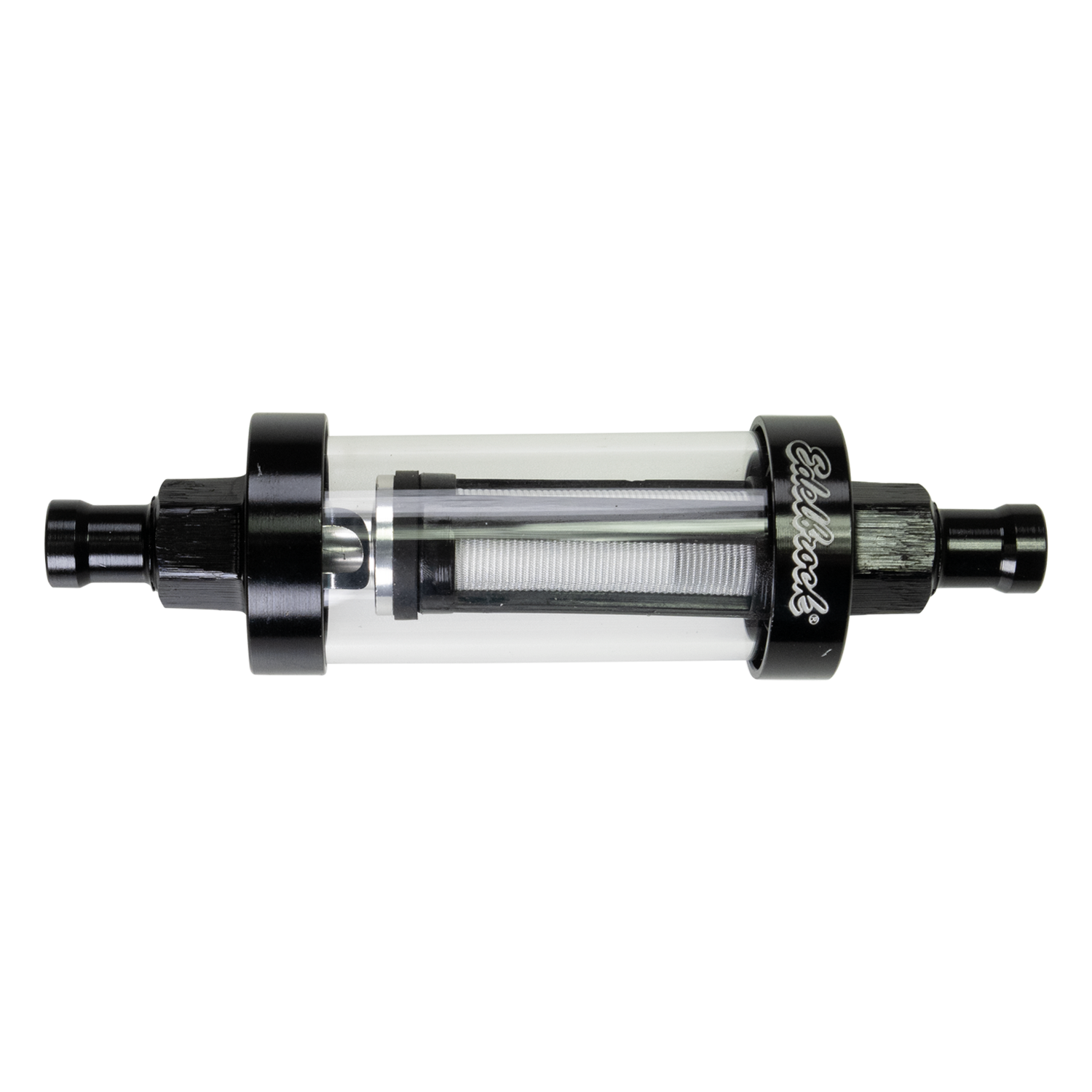Edelbrock Clear View Fuel Filter for 5/16" I.D. Hose dresses up any carbureted car’s engine bay, providing a quick visual check of fuel flow and condition. Fully machined aluminum ends are laser inscribed with barbed inlet/outlet sizes and attractively E-coated black for durability. For use with rubber fuel lines rated up to 10psi. A serviceable 100-micron nylon filter element keeps dirt and debris from clogging up small passages in your carburetor.