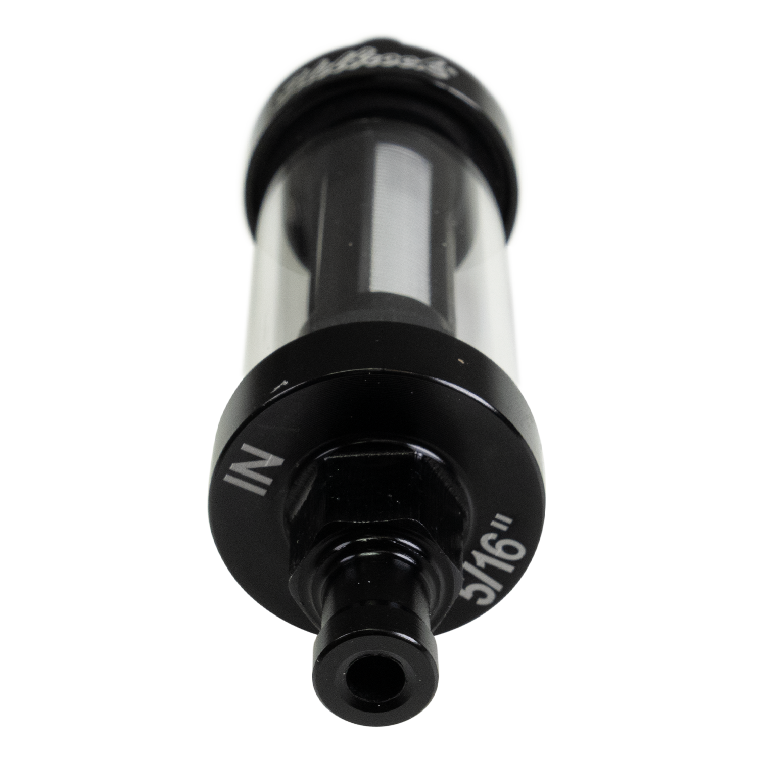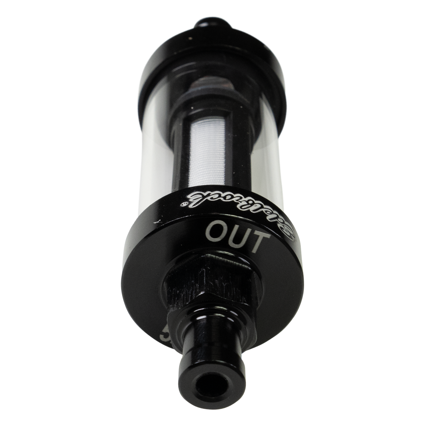 Clear View Fuel Filter for 5/16“ I.D. Hoses give a visual check of fuel flow and condition with a serviceable 100-micron nylon filter. E-coated aluminum ends are laser inscribed with barbed inlet/outlet sizing. For lines up to 10psi.