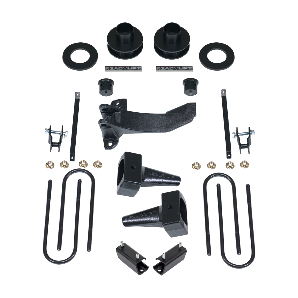 ReadyLIFT Suspension offers a suspension product designed specifically for the 2011-2016 Ford Super Duty. The 2011-2016 F250 4WD 2.5"F/2.0"R SST Lift Kit is engineered to provide the ideal front and rear lift for towing or hauling, maintaining a slight rake. It accommodates wheel and tire combinations up to 35 inches while preserving the smooth OEM ride and drivability. This kit includes various components such as 2.5-inch powder-coated steel coil spring spacers, sound isolators, shock extensions, sway bar frame mount spacers, bump stop extensions, carrier bearing spacer, and track bar relocation bracket. Additionally, it features ReadyLIFT's 4.0-inch OEM-style cast iron block to achieve near factory rake, enhancing the lifted stance. The 2.5-inch coil spacers and sound isolators ensure a comfortable OEM ride, while shock extensions allow the retention of existing front shocks. To level the truck, front sway bar frame mounts are spaced downward, a unique feature of this kit. Bumpstop extensions maintain the factory distance between the bump stop and axle, and a carrier bearing spacer allows for driveshaft angle adjustment. The kit also includes a track bar relocation bracket for improved steering quality. Installation is made easy with ReadyLIFT's Smart Suspension Technology, requiring no cutting or drilling. Moreover, this kit is backed by a lifetime guarantee against manufacturing defects. Note that it is designed for F250 trucks with one-piece drive shaft and may not work with certain aftermarket or factory air spring/load leveling kits that attach to the bump stop tangs, as this can void block warranties and lead to block bump stop tang failure. Upgrade your 2011-2016 F250 4WD with this reliable and user-friendly 2.5" SST Lift Kit for an enhanced lifted stance with a slight rake while preserving the factory ride quality. Save time and money with this value-packed solution from ReadyLIFT.