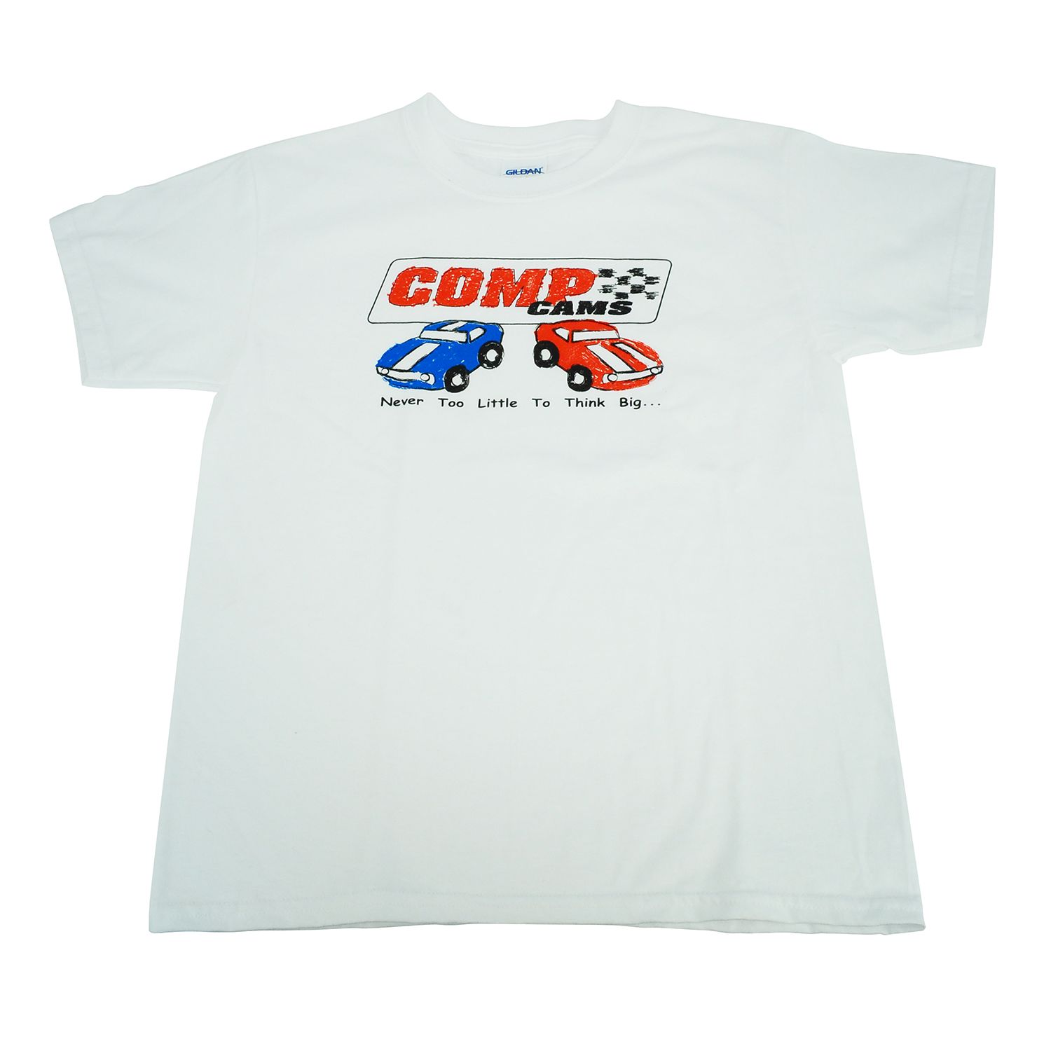 two cars and the text "Never too little to think big" on the front of the shirt.