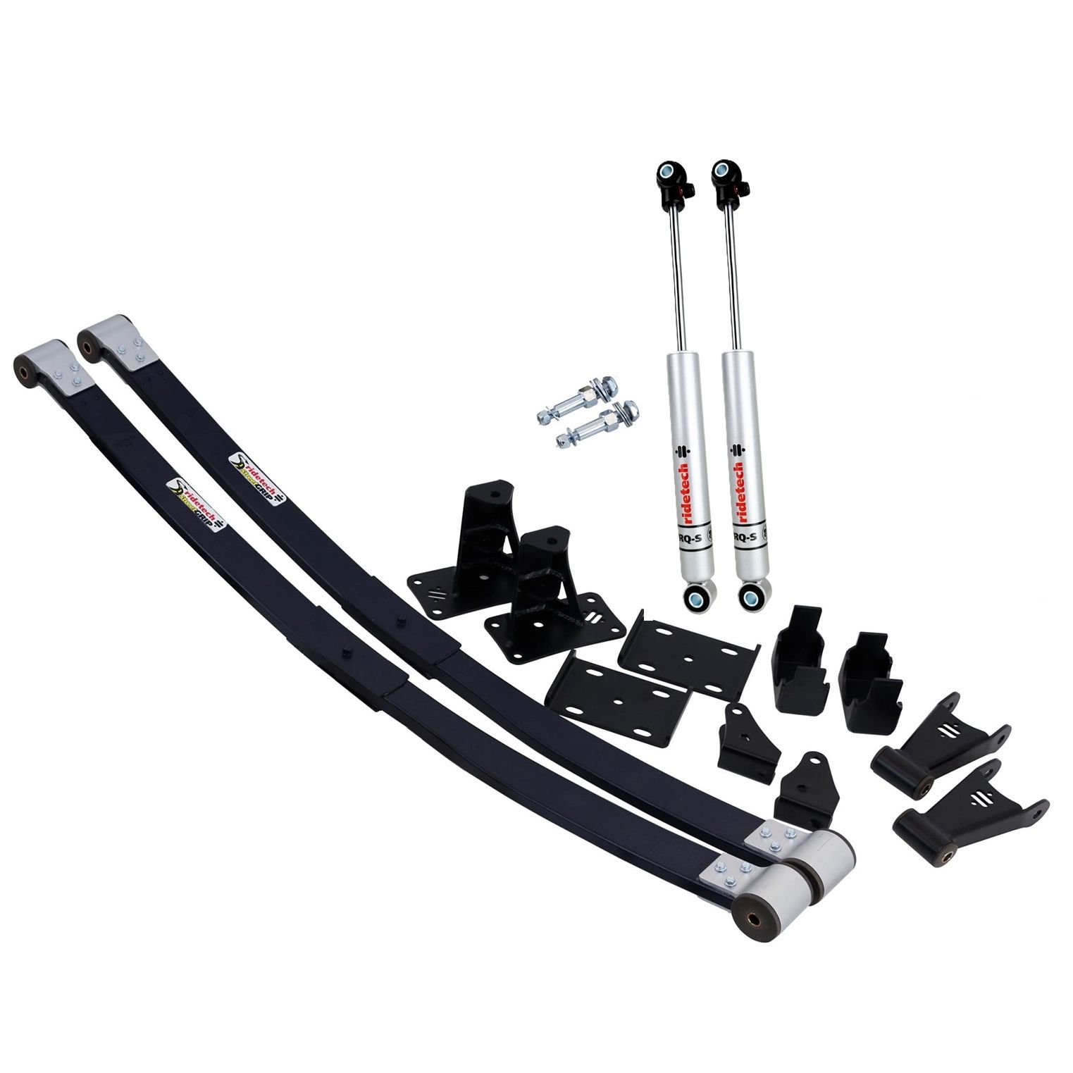 Composite leaf springs and RQ-S shocks for 1973-1987 C10. Includes leaf springs, delrin bushings, shackles, hangers, flip brackets, U-bolts, RQ-S shocks, shock mounts and hardware.
