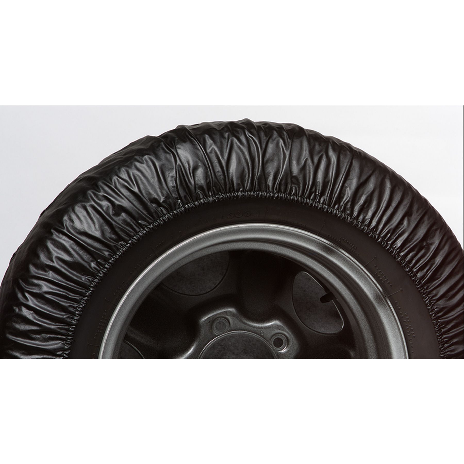 • Durable heav-duty weather resistant vinyl fabric protects against sun, rain, and elements;Reinforced double needled seams ensure long-lasting durability;Secure fit with shock cord hem provides a snug, reliable fit;Easy clip-on installation design allows for quick and simple setup;Medium: Tire diameter 29.5″ to 31″; width 8.75″ to 10″