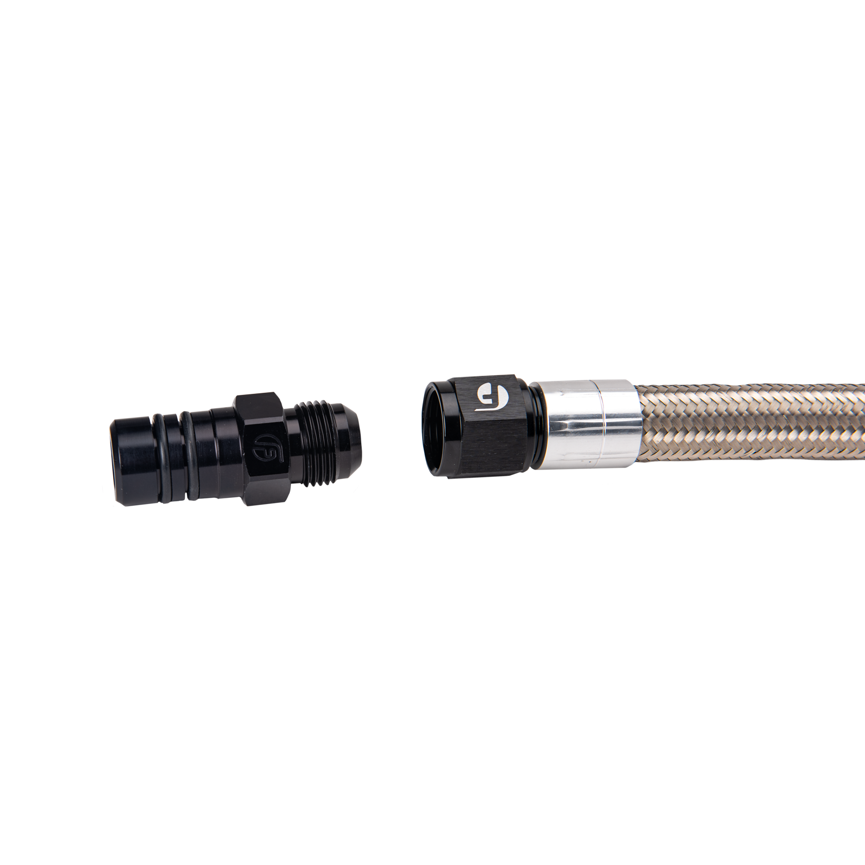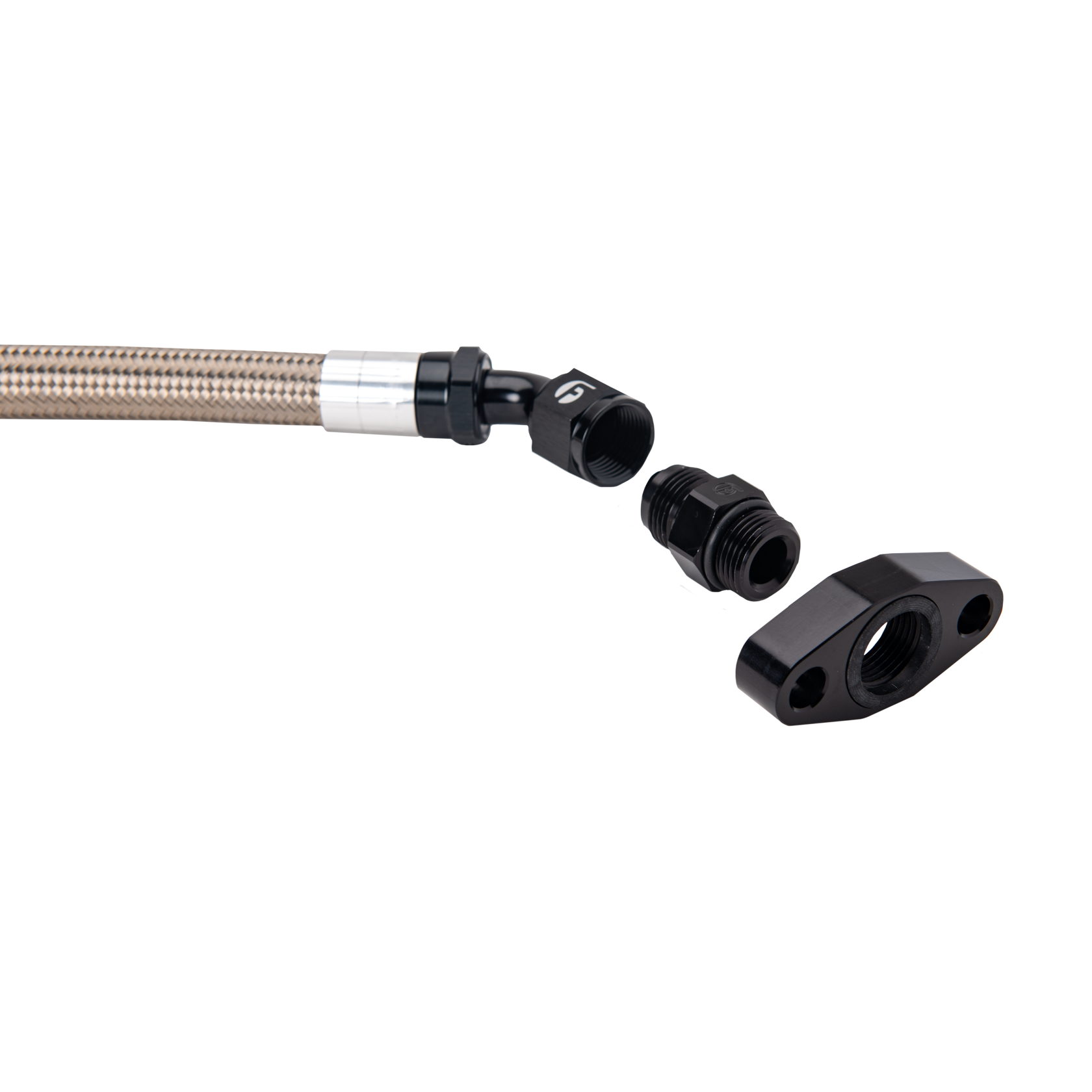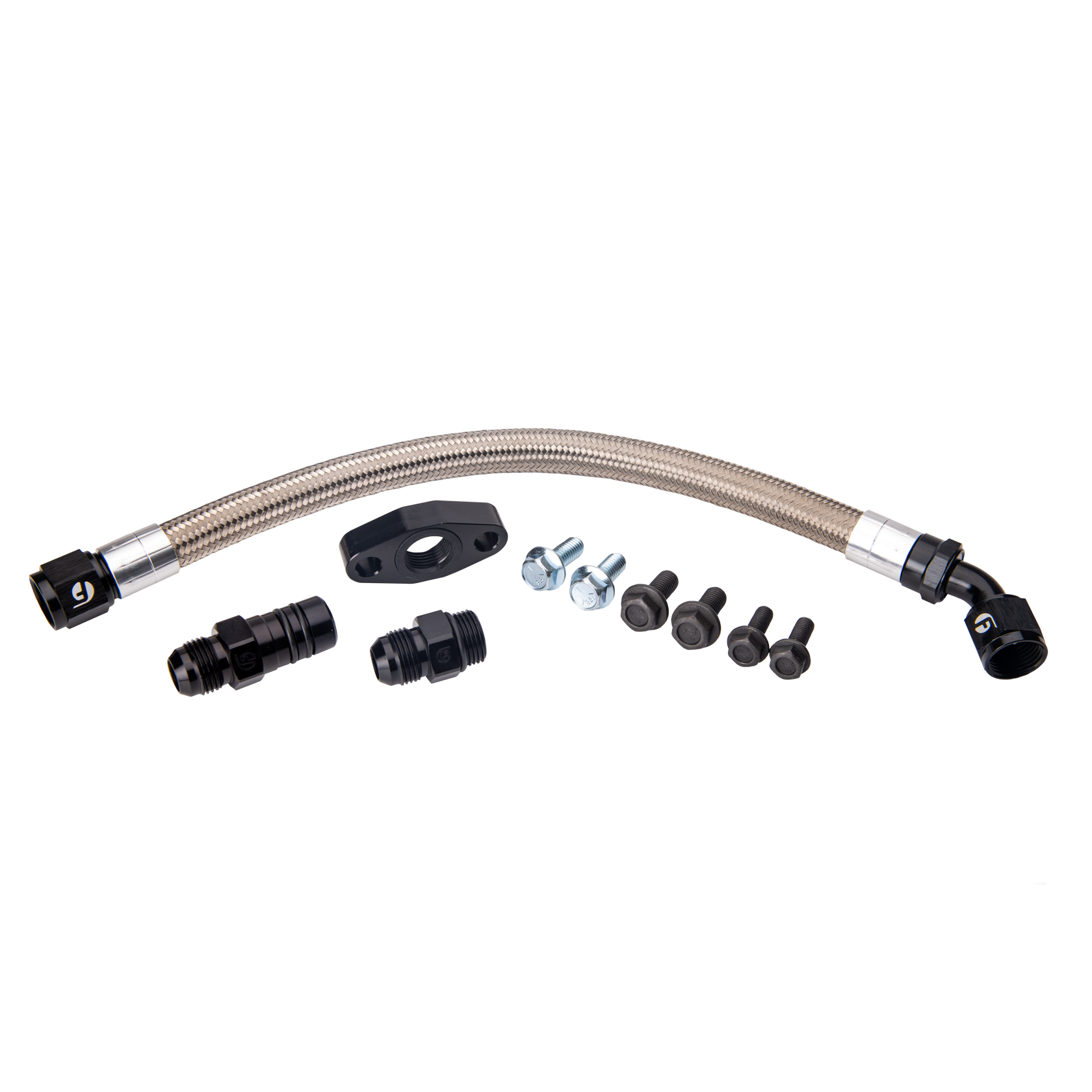 Put the finishing touches on your truck with this high quality Cummins Turbo Drain Tube Kit. The tube is braided stainless steel for durability on the exterior, and corrugate Teflon tubing for flow and maximum flexibility. The fittings are 6061 aluminum with black anodize and come complete with O-rings. The kit contains everything you need to connect your turbo to the factory drain location on your block when doing a 2nd Gen Swap. Kit Contents: Drain Tube (20" end-to-end) Cummins Turbo Drain Tube Adapter Turbo Drain Flange Adapter Turbo Drain Gasket 7/8-14 to -10AN Fitting (2) 3/8"-16 Flange Head Bolts (2) M10 x 1.5 Flange Head Bolts