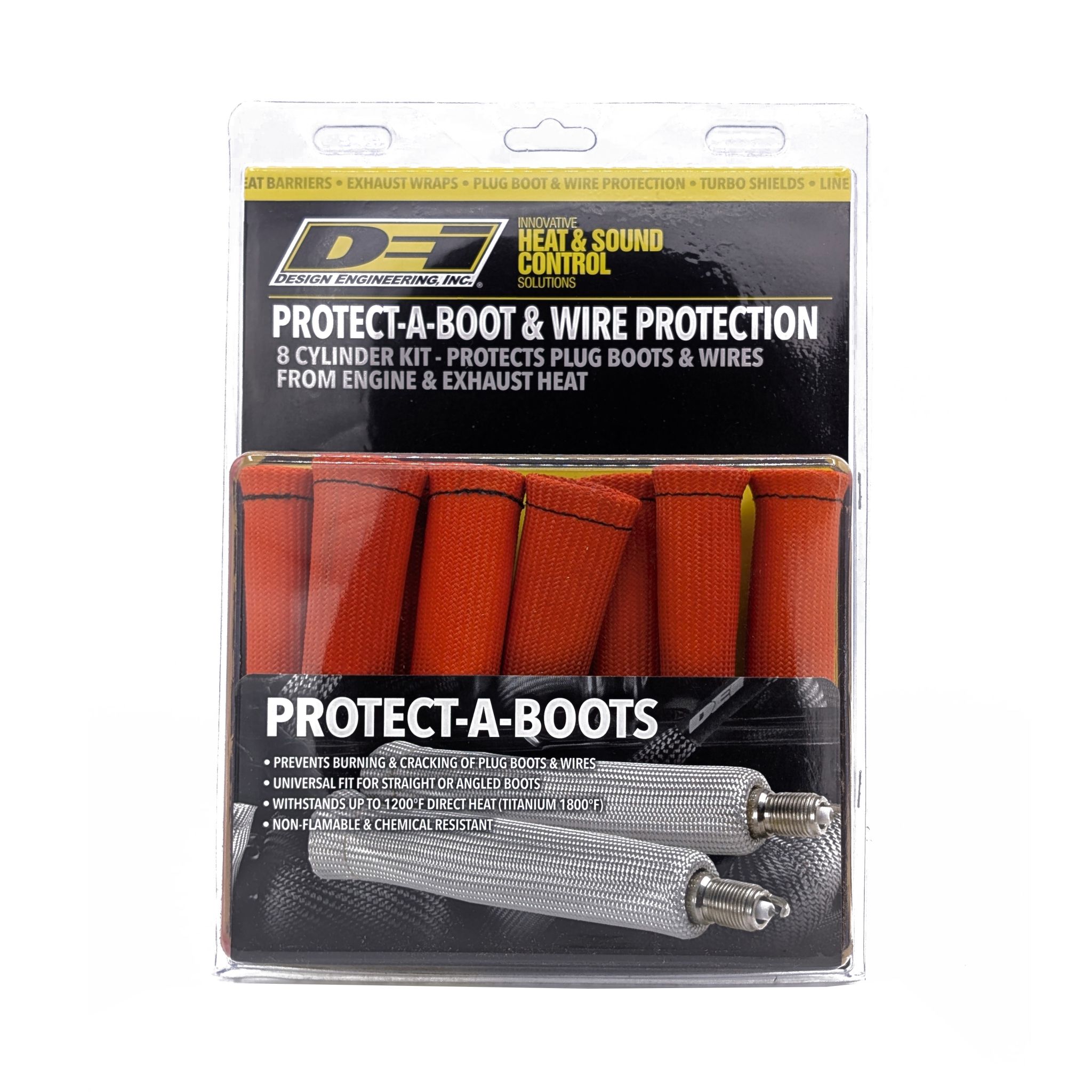 Protect-A-Boots solve the problem of burning and cracking plug boots and wires from header and engine heat. Features Made from a high temperature, nonflammable glass fiber material able to withstand temperatures up to 1000F. Boots are of double-wall construction. Advantages Boots & Sleeving provide protection against harmful, high under-hood temperatures. Shrink tubes are included to provide a water-tight seal. Benefits Protecting spark plug boots & wires helps prevent burn-through, hardening & cracking of boots. Boot Protectors are universal, fitting most straight or angled spark plug boots. Boot Protectors and Sleeving provide a professional finished look. Boots are 6 in. in length with a sewn in ring, and fit wire size up to 8mm. 4 Cylinder Kit Contains: 13 ft of line sleeving 12 – Hi-Temp Shrink Tubes 4 – Protect-A-Boots