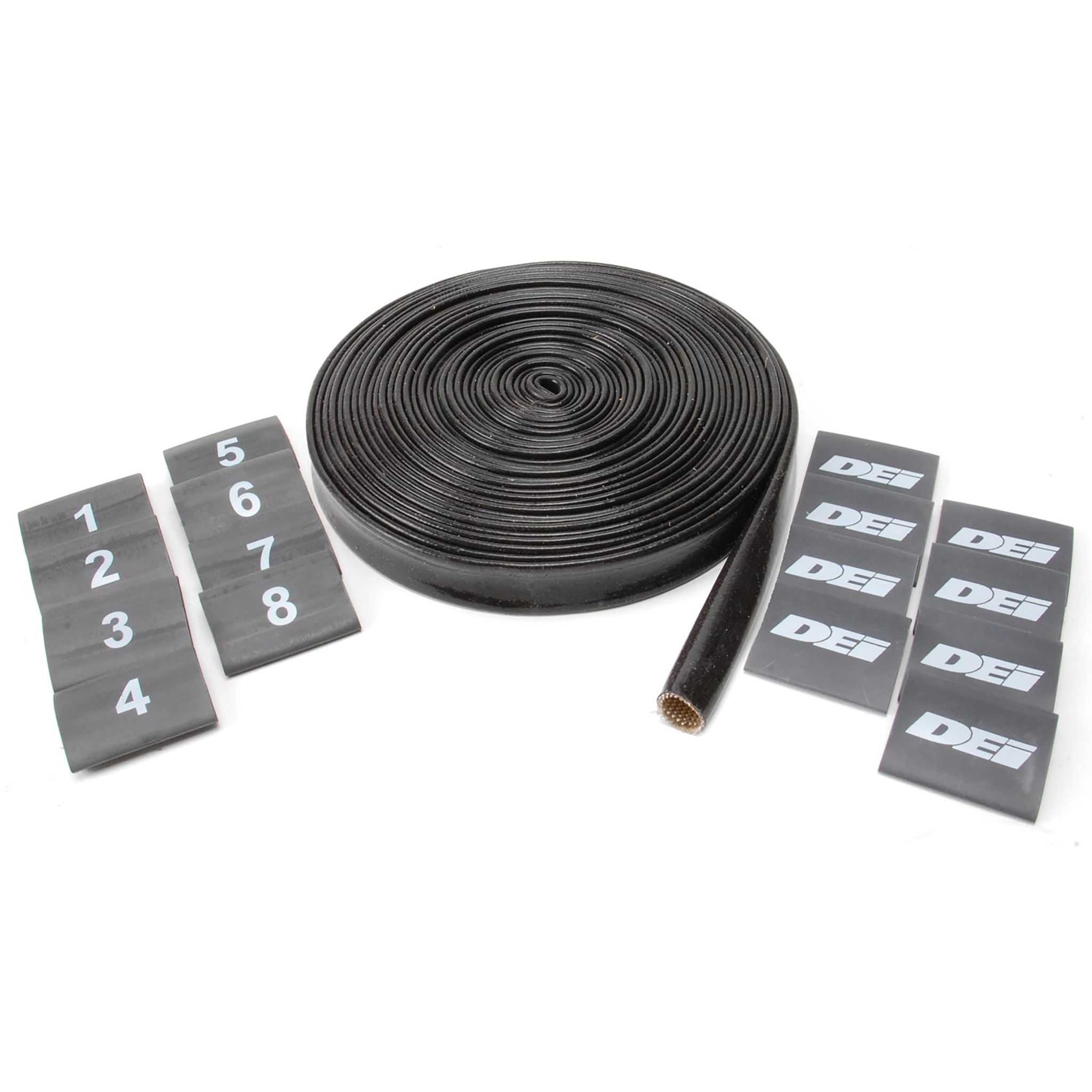 Includes: One 25 foot length of silicone covered braided glass fiber sleeving with a 3/8 inch inside diameter and 8 black heat shrink sleeves.