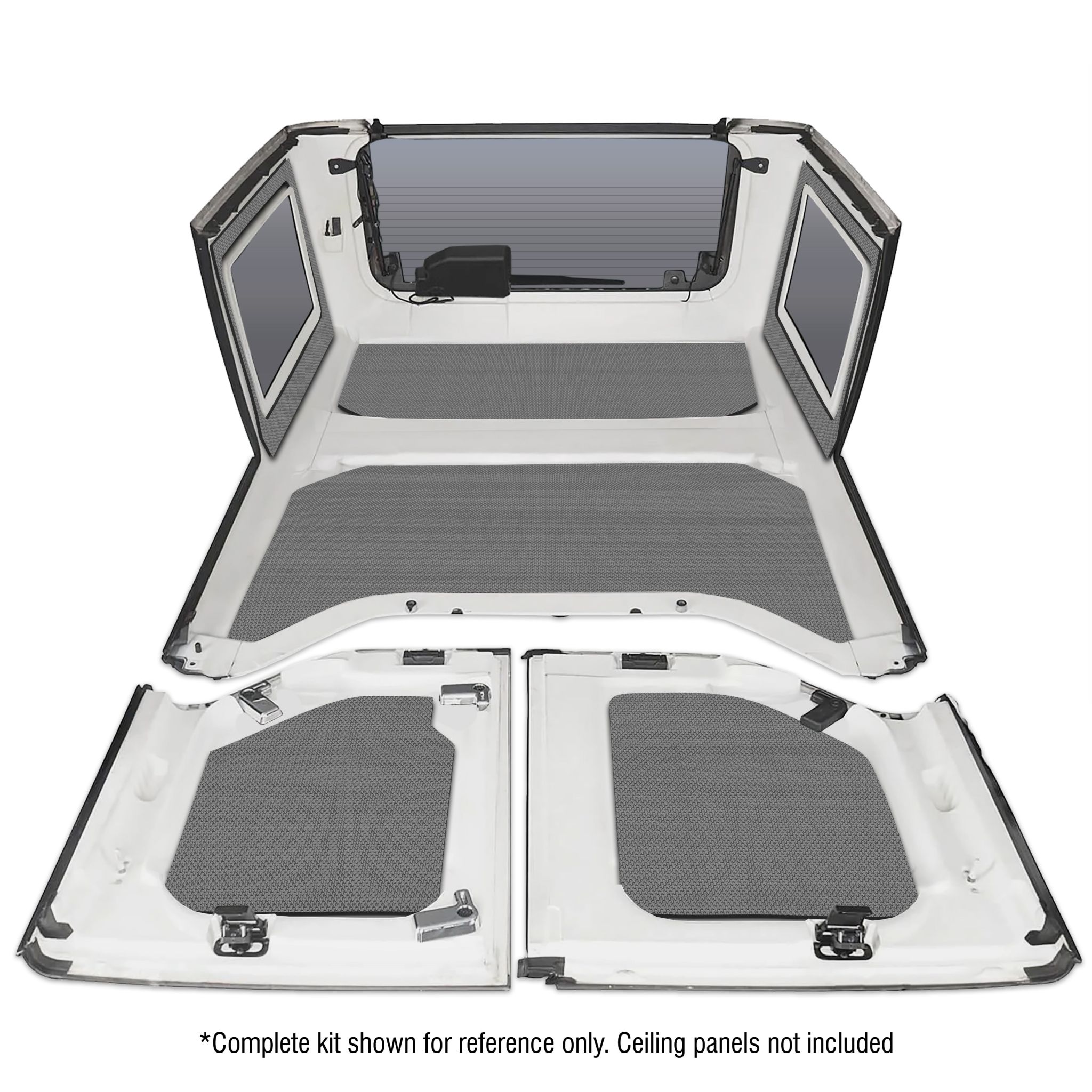 Riding in a Jeep(R) is great fun except for the truck's propensity for interior noise that makes it difficult to engage in conversations or even enjoy vehicle audio systems. Now there is an easy solution. Boom Mat's new Jeep Wrangler Sound Deadening HeadLiner provides a simple pre-shaped peel and stick kit that dresses up the interior of Jeep hard tops while minimizing annoying outside noise and vibrations while insulating from exterior weather conditions. Installed Boom Mat's new Sound Deadening Headliner has been tested to reduce noise levels from 3 to 4 decibels. This is a significant change in sound level that will improve overall interior acoustics so Jeep occupants can enjoy audio system and have conversations without excessive and irritating noise distractions. Headliner reduces noise levels 3 to 4 decibels Reduces radiant heat from roof Improves acoustics inside A significant change in noise level that will make it easier to have conversations & enjoy your favorite music Leather Look finish is easy to clean Durable for extreme off-roading