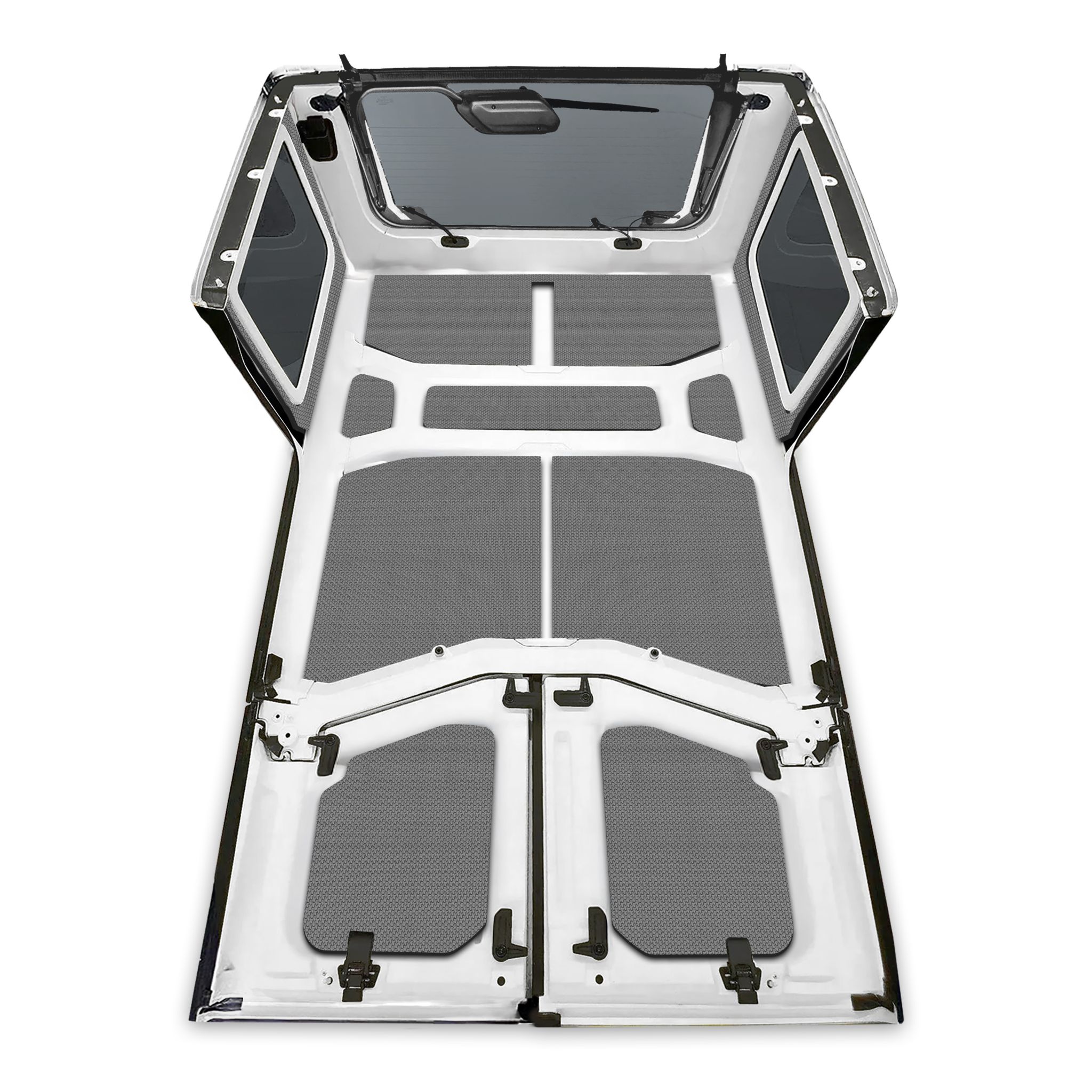 Riding in a Jeep(R) Gladiator is great fun except for the truck's propensity for interior noise that makes it difficult to engage in conversations or even enjoy vehicle audio systems. Now there is an easy solution. Boom Mat's new Jeep(R) Gladiator Sound Deadening Headliner provides a simple pre-shaped peel and stick kit that dresses up the interior of Jeep hard tops while minimizing annoying outside noise and vibrations while insulating from exterior weather conditions. Installed Boom Mat's new Sound Deadening Headliner has been tested to reduce noise levels from 3 to 4 decibels. This is a significant change in sound level that will improve overall interior acoustics so Jeep occupants can enjoy audio system and have conversations without excessive and irritating noise distractions. Headliner reduces noise levels 3 to 4 decibels Reduces radiant heat from roof Improves acoustics inside A significant change in noise level that will make it easier to have conversations & enjoy your favorite music Open Cell Polyurethane Foam Finish is a Polymer Surface Treatment