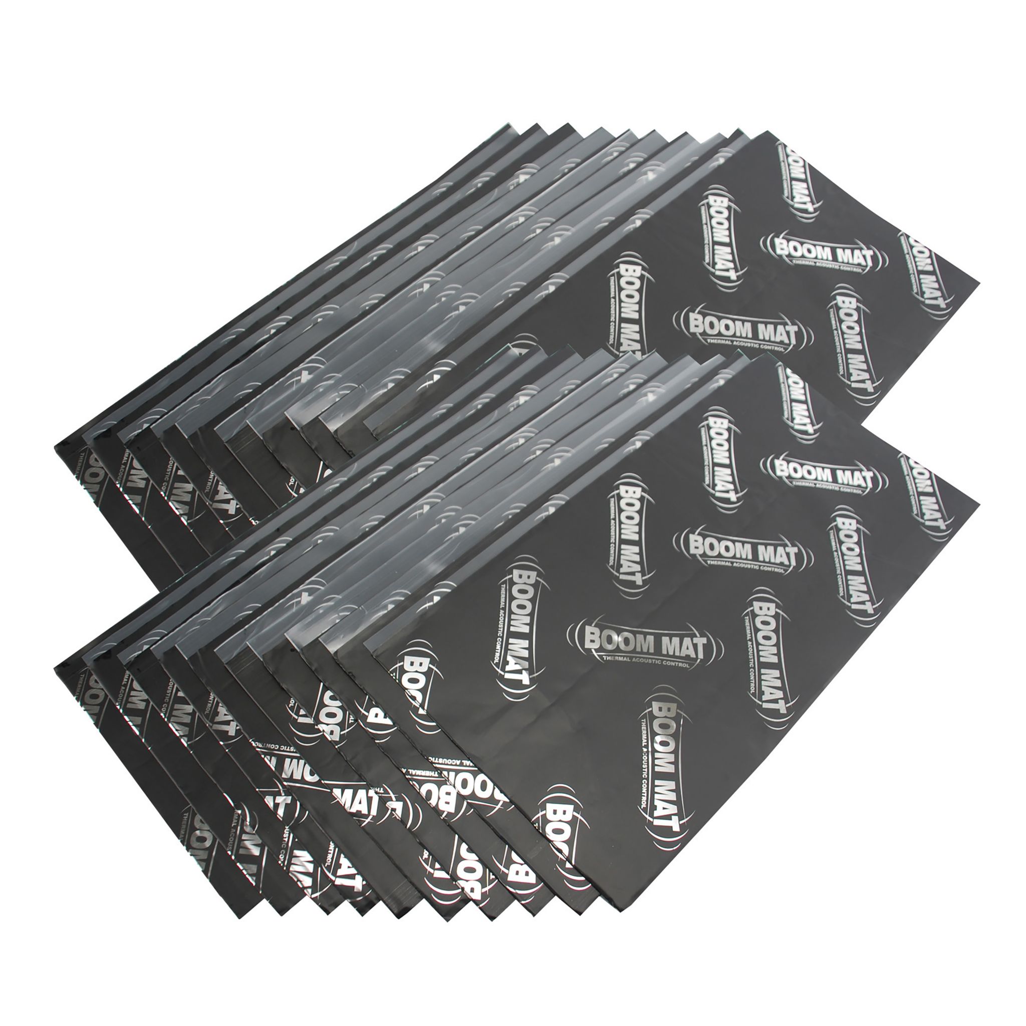 Boom Mat Vibration Damping Material is a premium quality damping material providing extreme noise damping for the most demanding commercial and sound competition applications. Interior panels vibrate and generate noise. Boom Mat stops that noise by trapping it between our thick, 4 mil aluminum stiffening top skin and the asphalt free, pure butyl, noise constraining layer. Plus worry-free no snag adhesion to any interior surface, vertical or overhead, even in the most demanding of temperature extremes. Those quality components are what makes Boom Mat Vibration Damping Material require only 25-50% coverage to get the job done. This saves weight, material cost and installation time. Easy peel plastic release liner (not a paper backing that tears) Enhances stereo performance and sound Gives you a quiet and comfortable interior Minimal prep & install time Performs in extreme temperatures Use as a first layer to control noise and dampen vibrations 15 (fifteen) 12.5in x 24in sheets (30 sq. ft.) 4mm thick