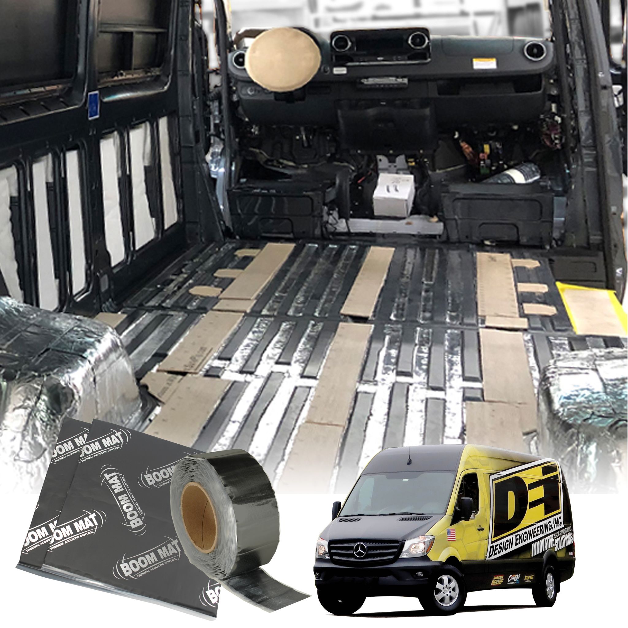 Includes: Two 2 inch by 3 inch strips of damping tape, two 2 inch by 12 inch strips of damping tape, six 6 inch by 6 inch sheets of Boom Mat Flex, thirty 6 inch by 12 inch sheets of Boom Mat Flex, and forty-seven 12 inch by 12 inch sheets of Boom Mat Flex.