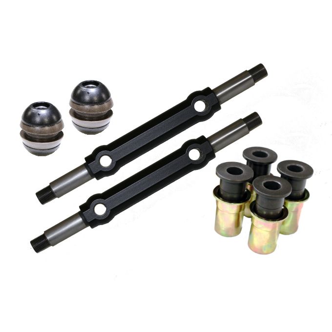 Delrin control arm bushings for 1964-1966 Mustang. Includes cross shafts, bushings, shells and sleeves for direct replacement of rubber bushings in the factory front upper and lower control arms.