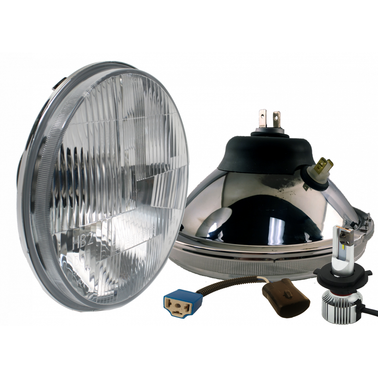 2 (ea) Headlight Assemblies, 2 (ea) H4 LEDs (4,000LM 25W), 2 (ea) Amber LED City Lights and Sockets, 2 (ea) Silicone Boots, 2 (ea) 9007 Adapters. Replaces any standard 7" headlight that uses H6024/ 9003 type harness. NOTE: To purchase replacement or alternate miniature bulbs go to Bulbs Section. (Search 5053)