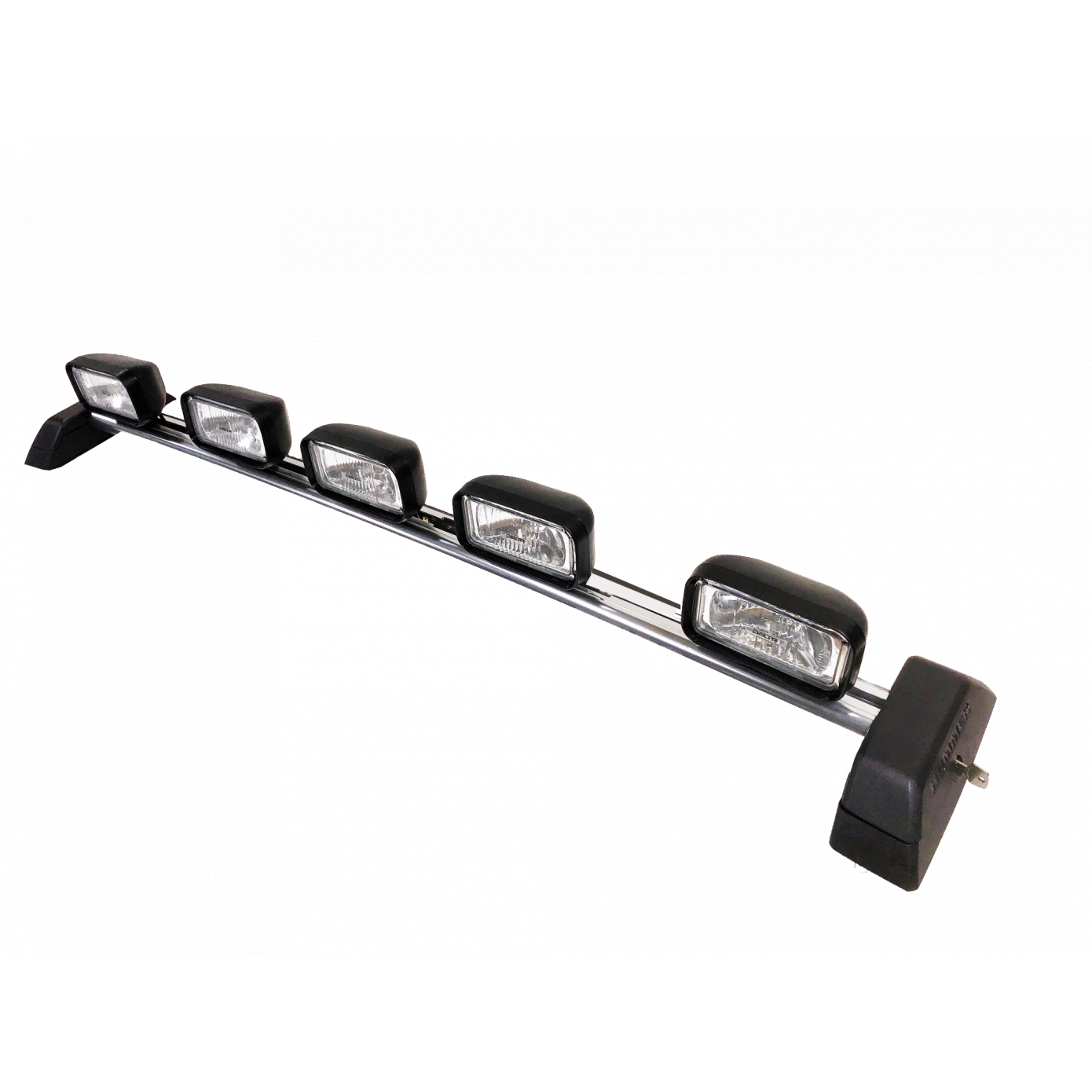 Hummer H3 FLEX LED Light Bar. This Delta FLEX aluminum roof light bar was built on a base of factory roof rack to hold five LED pods putting up a total of 50,000 Lm of illumination, at 6,000K of near daylight color brightness. The light bar mounts on existing Hummer roof rails, which can be adjusted in either direction to deliver a desired beam of light. Each light pod is built-into a PVC-rubber housing and equipped with Delta's legendary prismatic glass lens optics. Made in USA.