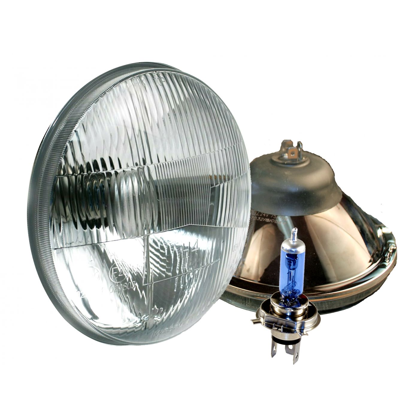 2 (ea) headlight assemblies, 2 (ea) H4 Xenon bulbs (60/ 55W), 2 (ea) silicone boots. Replaces any standard 7" headlight that uses H6024/ 9003 type harness.