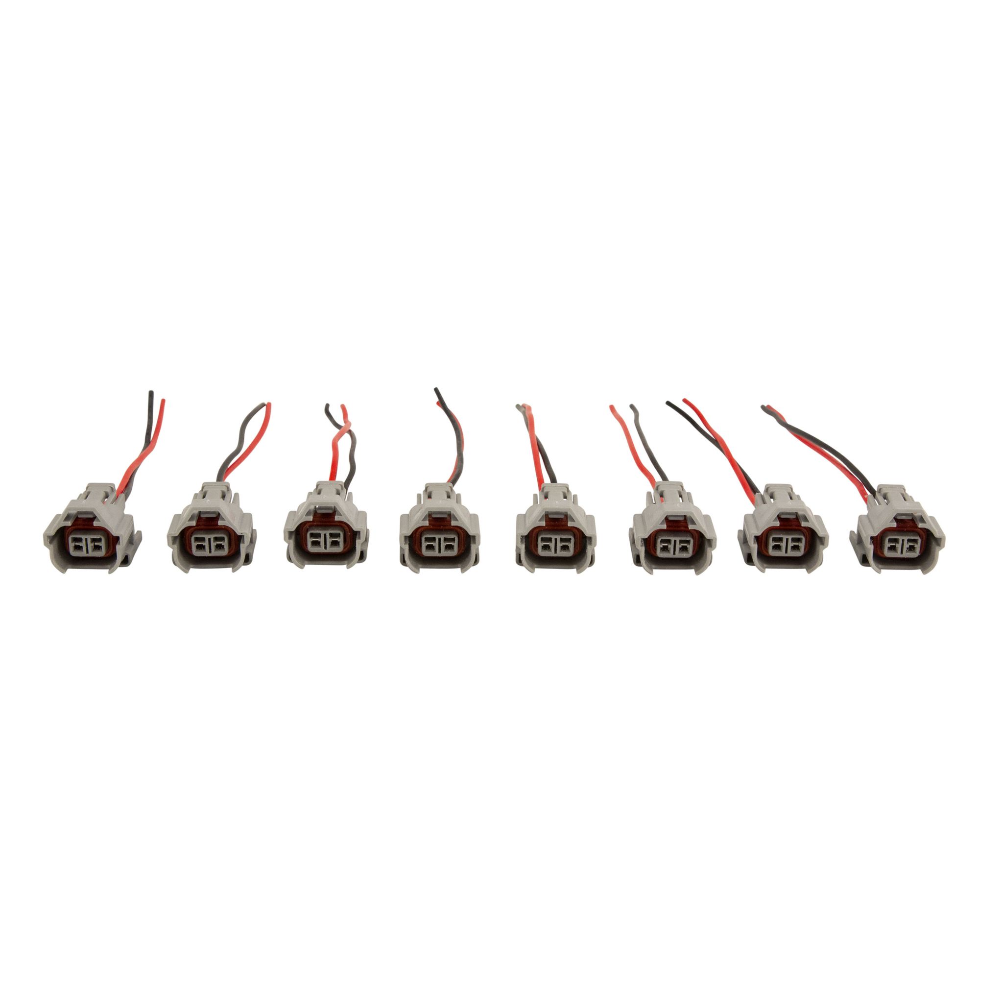 These fuel injector adapter harnesses adapt FAST 32107 242 Lb/Hr LS3 Fuel Injectors to a non-Denso fuel injector harness. Kit includes eight pre-assembled adapters with pigtails. Requires user to terminate pigtails to injector harness.