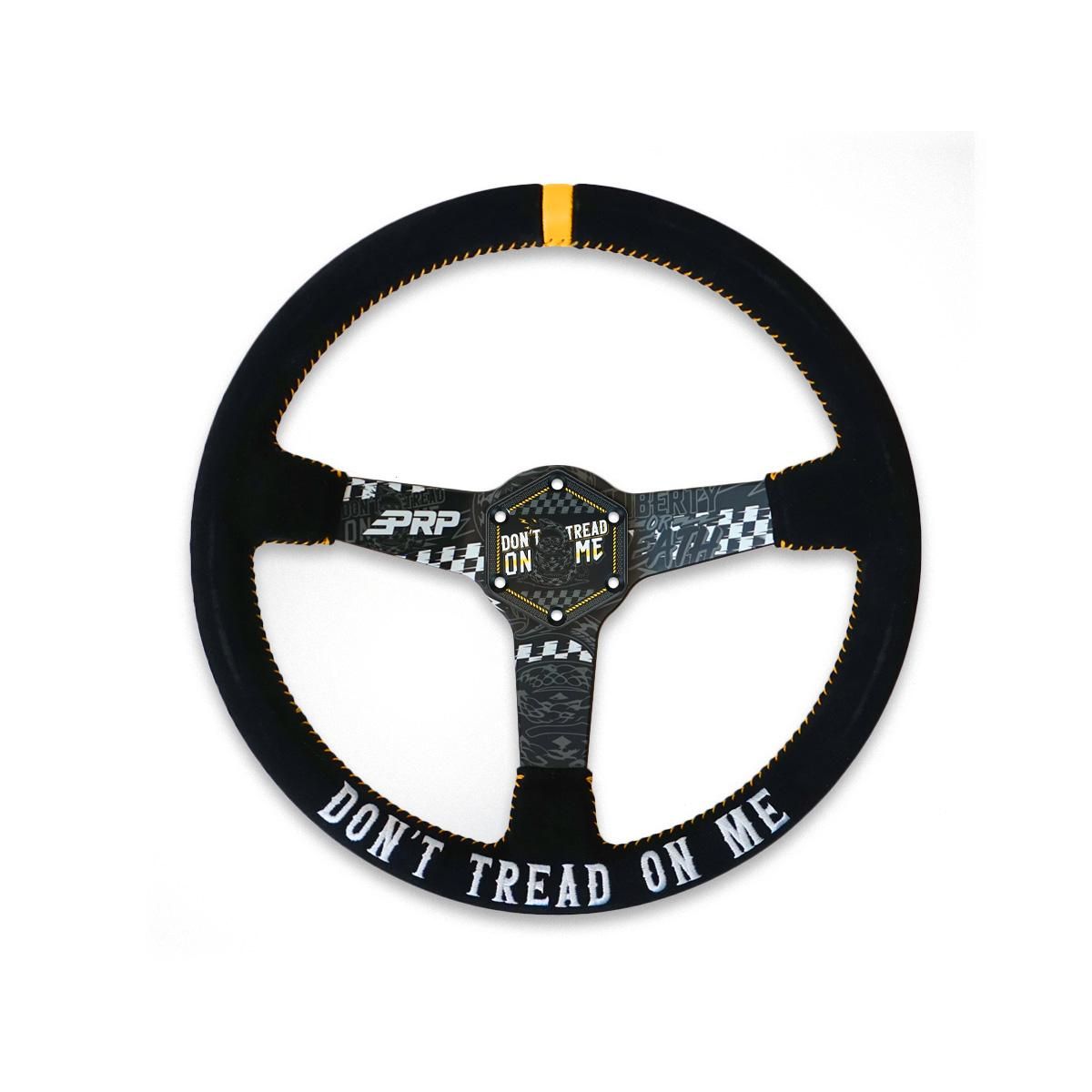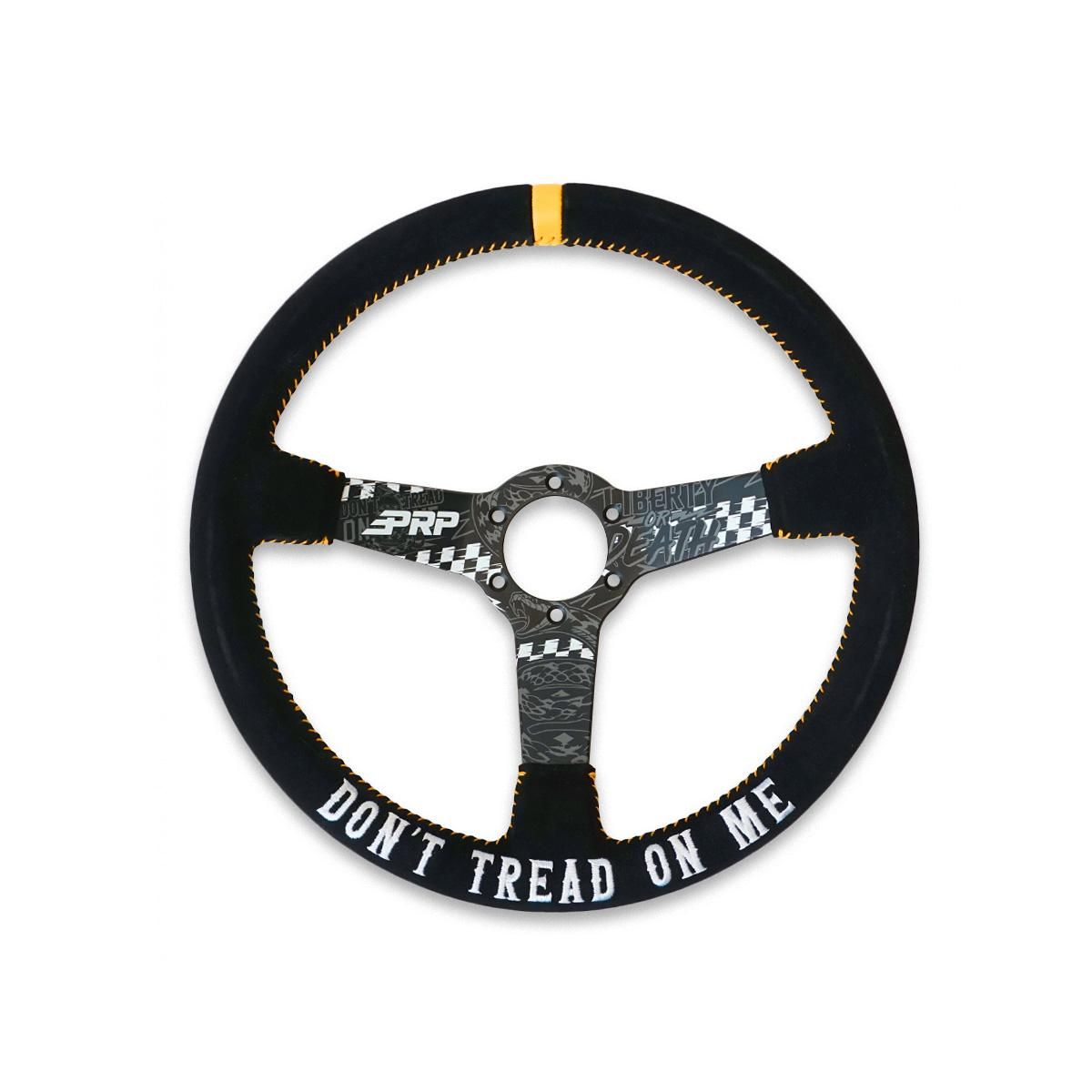 Revolutionize your ride with PRP's Limited Edition Dont Tread on Me Deep Dish Steering Wheel! Like all PRP Steering Wheels, these limited editions are Built for Off-Road. Constructed from high-strength aluminum, it can take the abuse of racing rock crawling or flying across the desert. Thew wheel featues a unique spoke design with Liberty or Death emblazoned on the side. The grips use high quality and durable black suede, with Dont Tread on Me embroidered on the bottom. The steering wheel has a 6-point bolt pattern, specifically chosen because it fits most aftermarket hubs and quick releases. Customize the look of your Dont Tread on Me Wheel by adding on one of PRP's Dont Tread on Me, Liberty or Death, or Snake-PRP Center Caps. Features: Made from high strength aluminum – tested at 500lbs to first deflection 6 Point Bolt Pattern – Most common in off-road industry quick release adapters. Durable and moisture resistant High-Quality Black Suede and Yellow Leather Grip Measurements: Diameter – 13 inches Weight – 2 lbs Dish depth – 3 inches Bolt Pattern Measurement – 2.75"