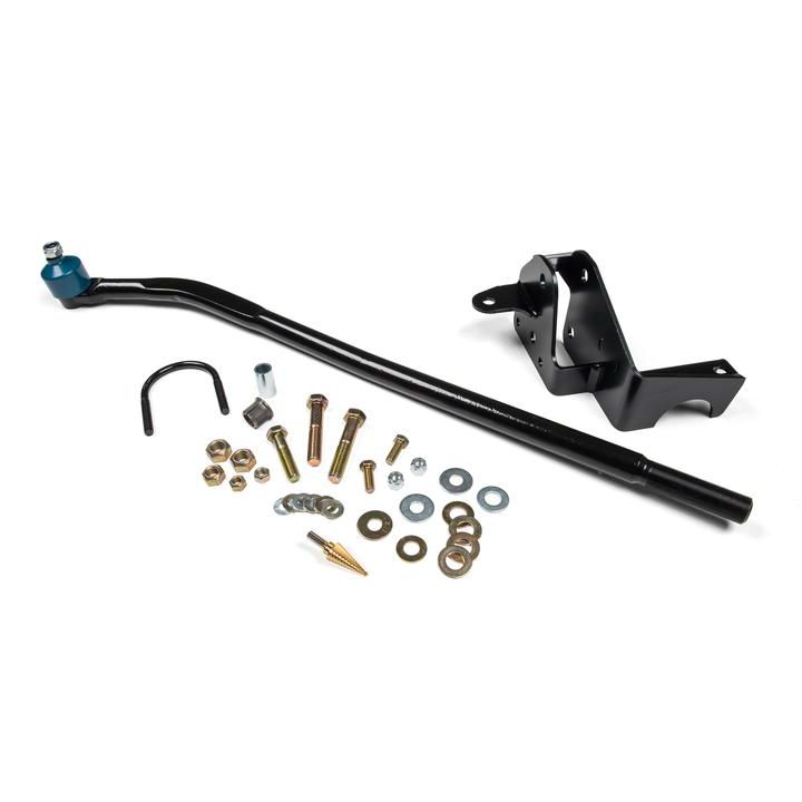 JKS Manufacturing’s Drag Link Flip kit for JK Wranglers consists of a new drag link, a Track Bar bracket and a tapered steering arm insert. The design flattens out steering angles with lift heights of 3" and above, while providing correct geometry to increased droop travel. Bringing angles back to stock with the increased ride height of a lift removes the bump steer commonly associated with lifted solid axle suspensions. Drilling is required with the supplied 7/8” step bit. 3" tall front aluminum bump stop extensions are necessary for proper clearance at full bump. JKS1130 extensions available separately.