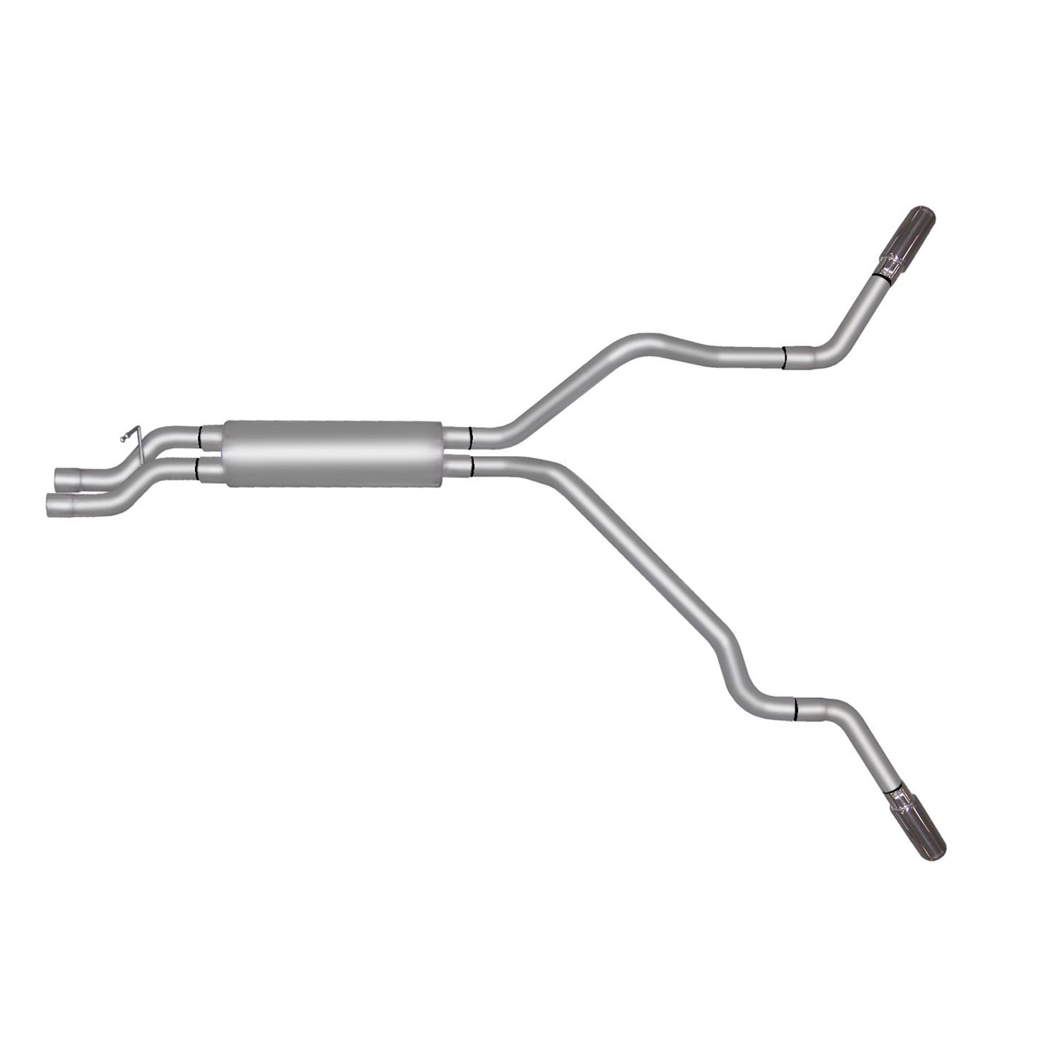 For the extremist who wants to take their truck to the next level, this dual bolt-on Cat back system is for you. This system exists behind the rear tires at an aggressive angle with a powerful exhaust tone. You will gain bold street looks with powerful dyno tuned and tested street performance gains. You can expect to experience gains on average of 15-20 horsepower. Gibson muffler provides a mean performance sound and complemented with polished Stainless Tip. Easy bolt-on installation. No welding required. Backed by a Lifetime Limited Warranty. If you want Extreme, this system is it.