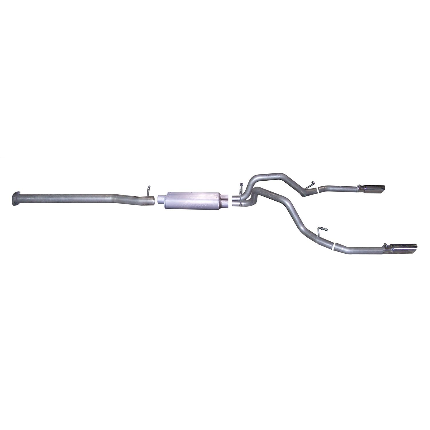 For the enthusiast who wants an awesome look and aggressive throaty sound this Dual Split Cat back exhaust is for you. Gibson Exhaust Systems decrease backpressure and produce more torque and increased horsepower. Typical gains average of 15-20 horsepower. Stainless dual Tip exit straight out the back. Works with most bumpers, roll pans and trailer hitches. Exhaust sound is louder under towing conditions. Hassle Free bolt- on installation. No welding required. Backed by a Lifetime Limited Warranty.