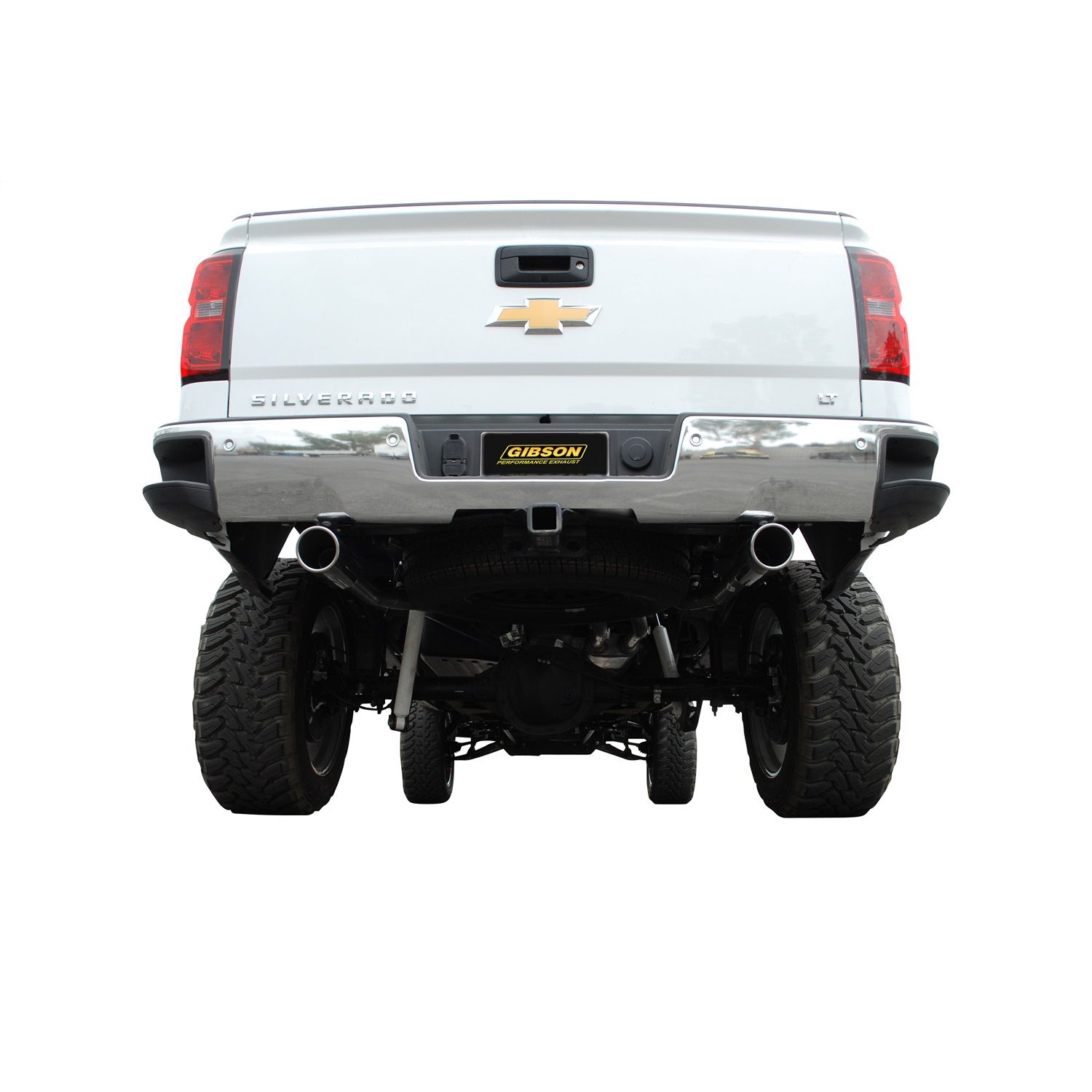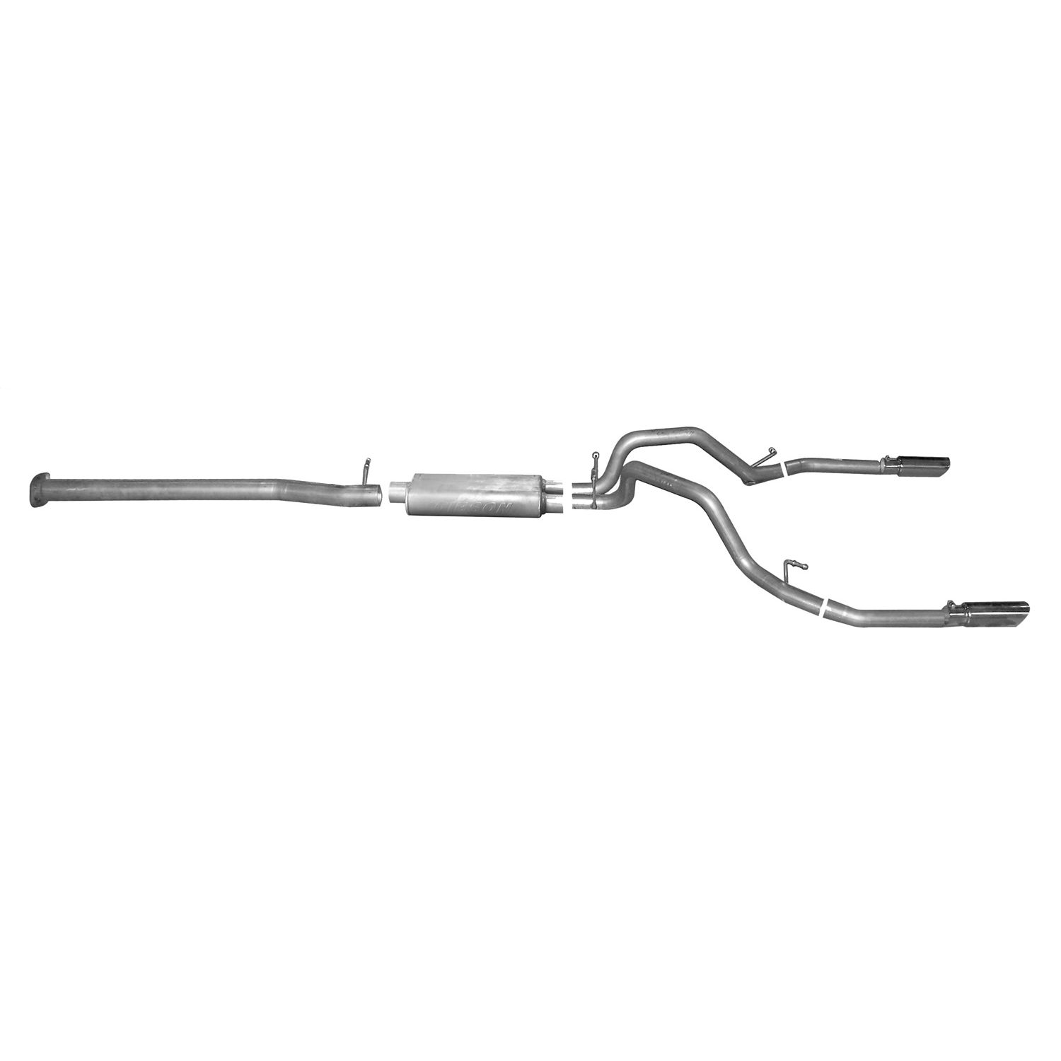 For the enthusiast who wants an awesome look and aggressive throaty sound this Dual Split Cat back exhaust is for you. Gibson Exhaust Systems decrease backpressure and produce more torque and increased horsepower. Typical gains average of 18-20 horsepower. Stainless dual Tip exit straight out the back. Works with most bumpers, roll pans and trailer hitches. Exhaust sound is louder under towing conditions. Hassle Free bolt- on installation. No welding required.
