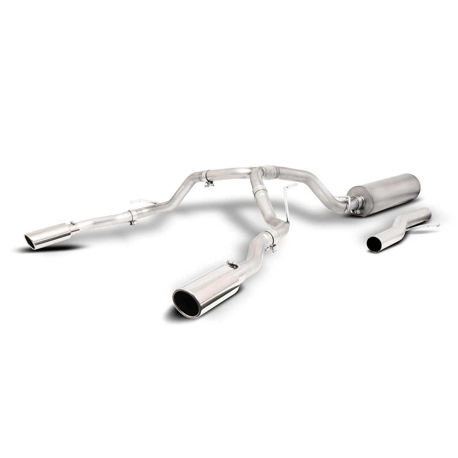 For the enthusiast who wants an awesome look and Mild sound this Dual Split Cat back exhaust is for you. Gibson Exhaust Systems decrease backpressure and produce more torque and increased horsepower while maintaining similar factory interior sound levels. Typical gains average of 15-20 horsepower. Stainless dual Tip exit straight out the back. Works with most bumpers, roll pans and trailer hitches. Exhaust sound is louder under towing conditions. Hassle Free bolt- on installation. No welding required. Backed by a Lifetime Limited Warranty.