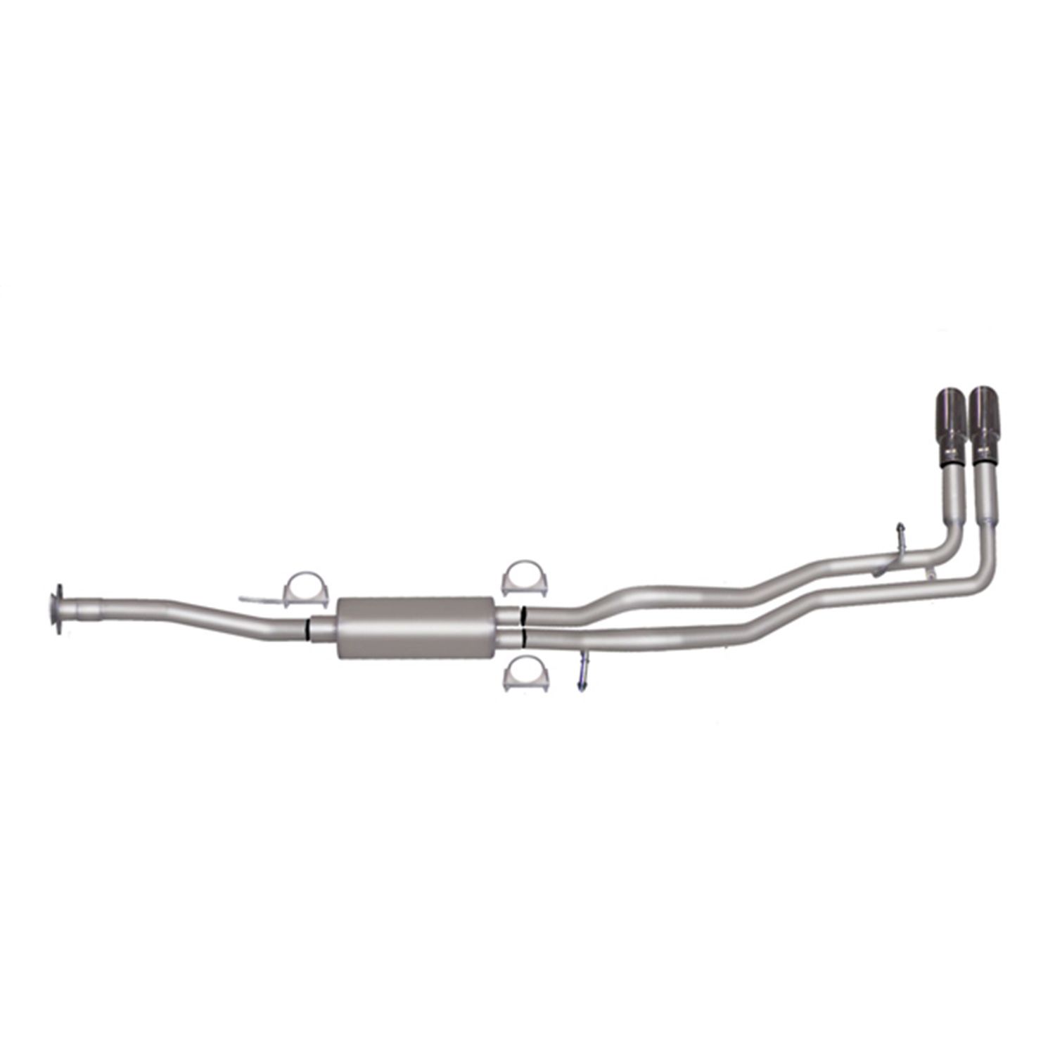 If youre looking to add a little style to your Truck or SUV and want to keep the exhaust from affecting your tow trailer, this Dual Cat back Exhaust System is for you, exiting behind the rear tire for a look that sets your vehicle apart on the street or in the dirt. Hassle free, bolt-on installation with professional looking results. No welding required. Backed by a Lifetime Limited Warranty. Gibson dual sport exhaust offers a powerful authoritative deep exhaust tone with no annoying noise inside the cab. Dyno tested to assure increased horsepower and produce more torque. Average horsepower gains are 10-15 and 15-20lb-ft of increase torque.