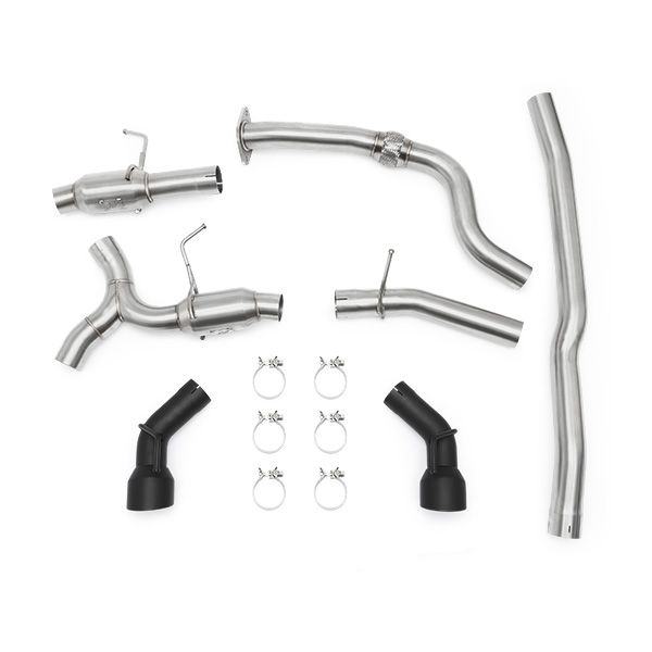 TechSpec Includes: (1) Stainless Steel Front Pipe w/ 2-Bolt Flange–(1) Stainless Steel Mid Pipe–(1) Stainless Steel Rear Pipe–(2) Stainless Steel Mufflers–(2) 4.5-inch Double Wall Exhaust Tips–(4) 3-inch Exhaust Band Clamps–(2) Locking Nuts–Mishimoto Lifetime Warranty