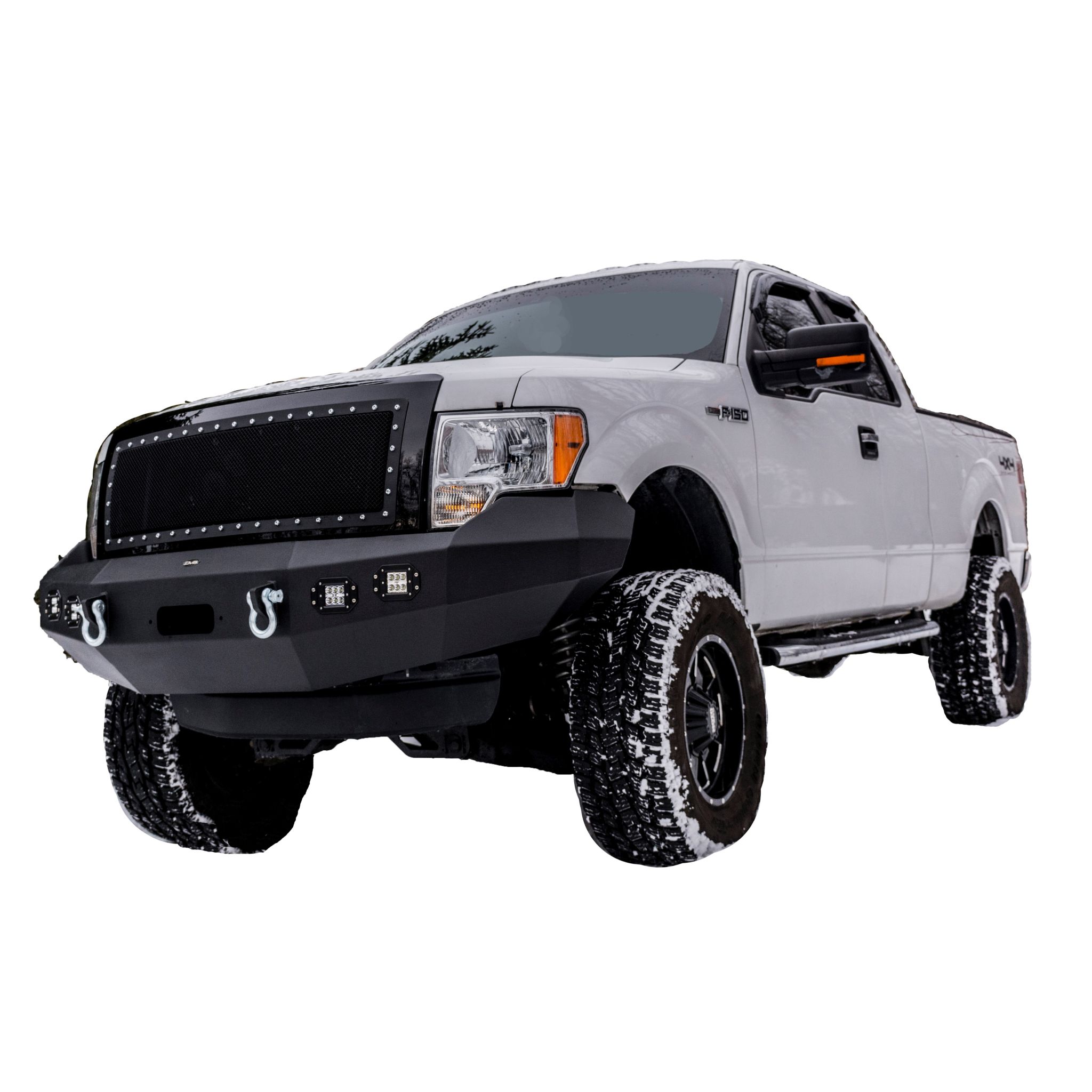 DV8 truck bumpers are made with high tensile strength 3/16 inch steel and reinforced with 1/4 inch steel in key areas which allows them to accommodate up to a 12,500 lbs. winch. We also use a 2 step powder coating process. First the bumper is coated with a thick layer of a proprietary compound for corrosion resistance, then we coat the bumper with our textured black, UV resistant, scratch resistant powder coating. The result is a bumper that will look good and perform well for the lifetime of the vehicle. Key Features: Front Bumper, 2009-2014 Ford F150 4.6L V8, 5.4L V8, 1/4 inch and 3/16 inch Steel Construction, 2 Stage Powder Coat Finish, Accommodates Up to a 12,500 lbs. Winch, DV8 No Hassle Warranty, Lights Included.