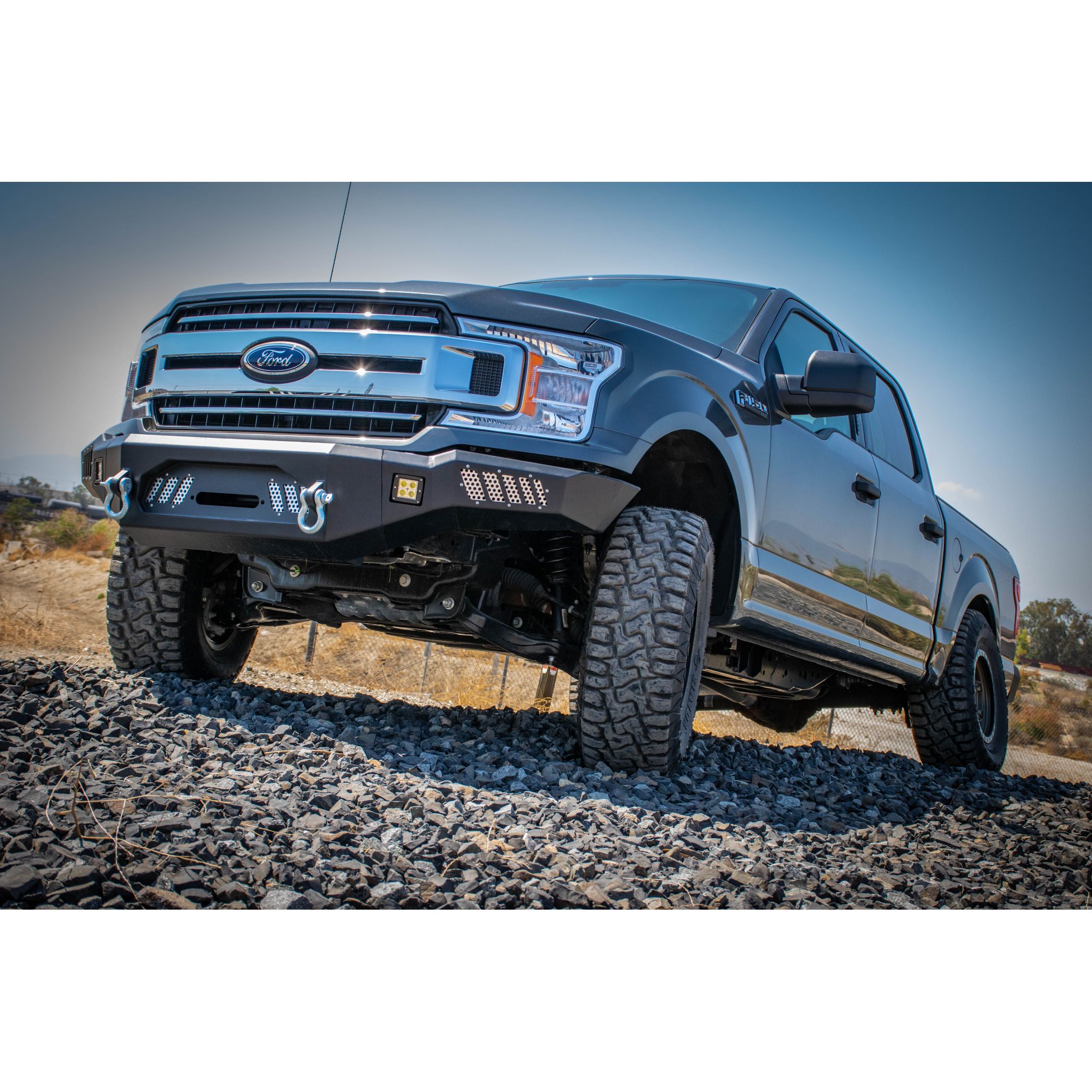 FBFF1-08 2018 to present Ford F-150 Front Bumper. The DV8 Offroad FBFF1-08 front bumper is designed to provide exceptional protection at a fraction of the weight of ordinary steel bumpers. Although these bumpers are made with 3/16 inch steel and 1/4 inch reinforcements throughout, DV8 shaves every pound possible off the bumper with strategic cutouts and mesh aluminum grills that can be removed and color matched to the vehicle. DV8 also integrates 2 LED light holes into the bumper for improved visibility. This bumper has 2 shackle recovery points and is designed to accommodate up to a 12,500 lbs. winch. The 3 piece design allows for easy replacement if one of the pieces is damaged in an accident and also provides the opportunity to swap out the end pieces for a different style i.e. Baja, plate, high clearance etc. DV8 Offroad did not sacrifice style or functionality when making these bumpers modular. Every bumper uses razor thin adjoining edges to keep the full-size bumper look and brackets that extend from the bumper ends to the frame where necessary to provide excellent strength and rigidity. This bumper comes powder coated in a sand texture black finish. This finish can be left as is or can be sanded down and painted over to color match the bumper to the vehicle. Key Features: Lighter than ordinary steel bumpers, Every bit as rigid as a one piece bumper, Cut outs for 2 LED Pod Lights (DV8 p/n B3CE16W4W), Accommodates up to 12,500 lbs. winch, 2 Shackle recovery points, Modular design allows for customization, Sand texture powder coat finish, Mesh inserts can be color keyed to vehicle, Lights Not Included.