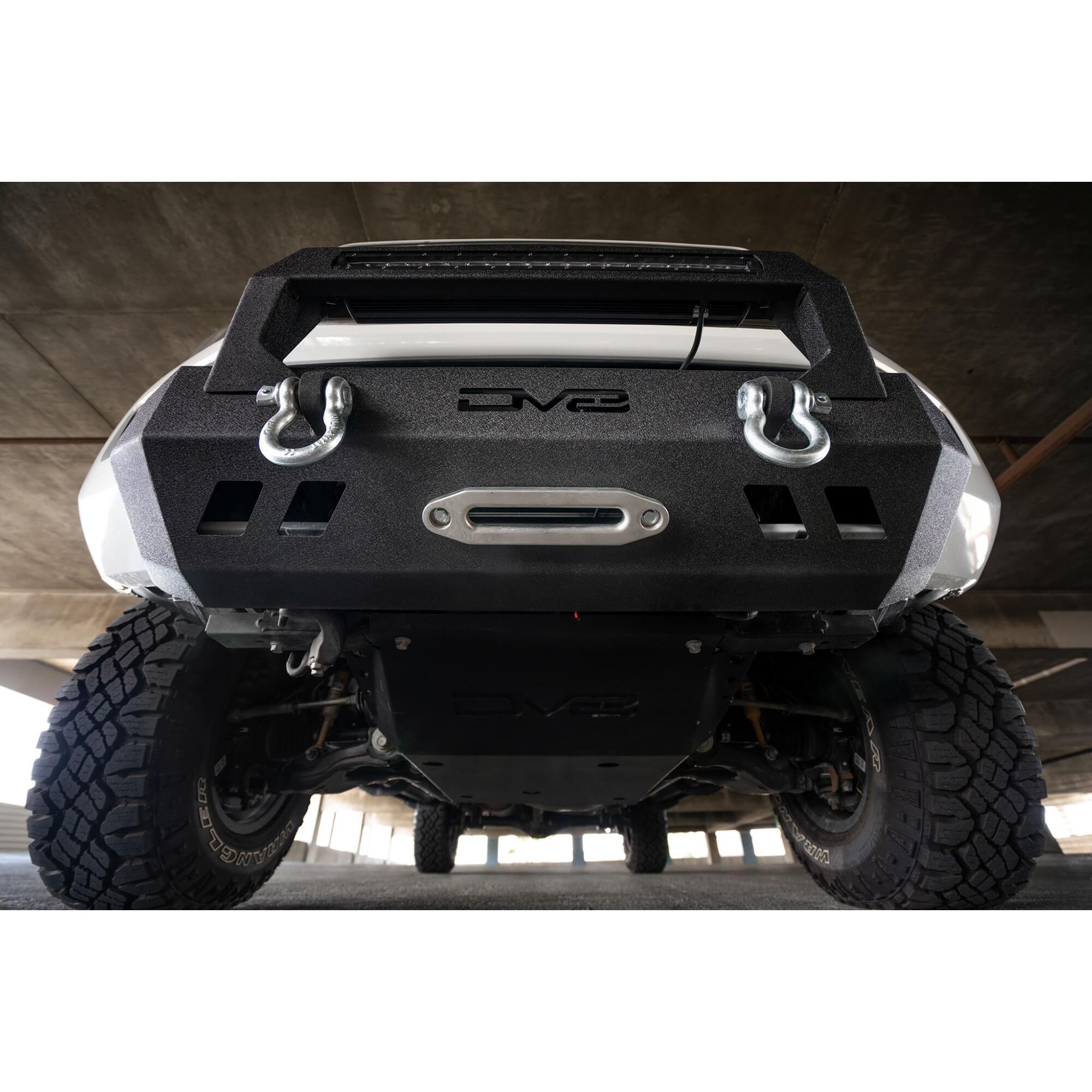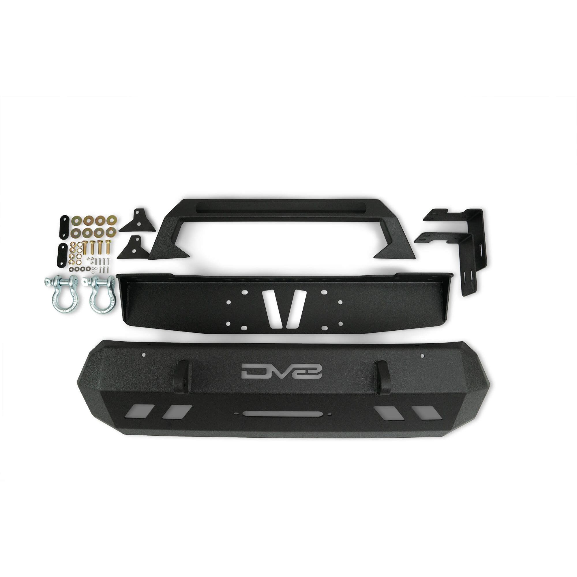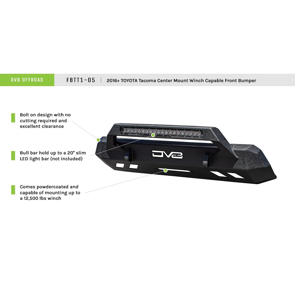 2016+ Toyota Tacoma Center Mount Winch Capable Front Bumper. The DV8 Offroad FBTT1-05 Tacoma Center Mount Bumper takes away the hassle of cutting your OEM plastic when installing an aftermarket bumper on a 16+ Tacoma and also allows you to mount up to a 12,500 lbs. winch. For those who want exceptional looks and function without committing to a full length bumper or cutting up a brand new truck. Details: Bolt on design, No cutting required, Excellent clearance, Mounts up to a 12,500 lbs. winch, Comes powder coated