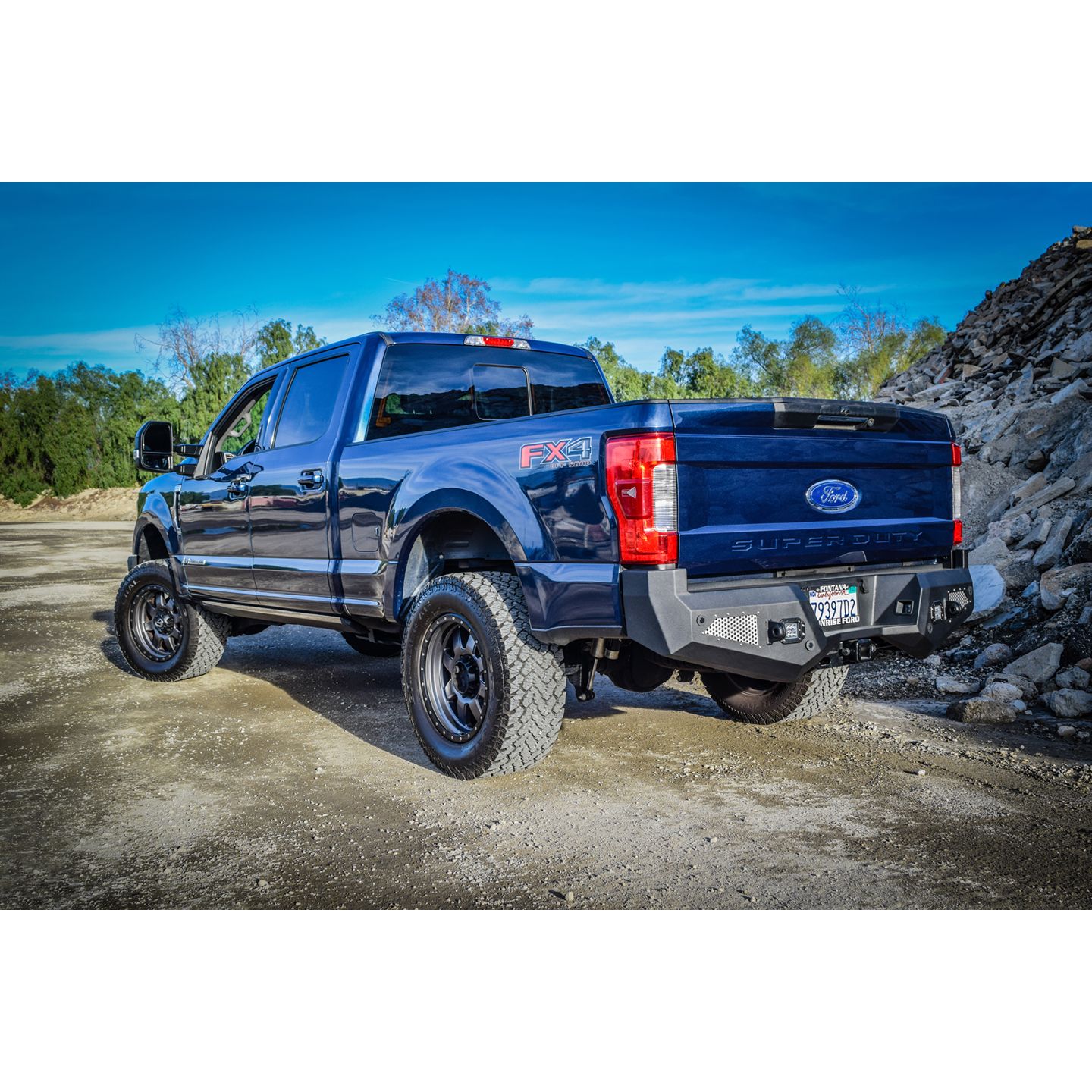 RBFF2-02 2017 to present Ford F-250/350/450 Rear Bumper. The DV8 Offroad RBFF1-02 rear bumper is designed to provide exceptional protection at a fraction of the weight of ordinary steel bumpers. Although these bumpers are made with 3/16 Inc. steel with 1/4 inch reinforcements throughout, DV8 shaves every pound possible off of the bumper with strategic cutouts and mesh aluminum grills that can be removed and color keyed to the vehicle. DV8 also integrates 2 LED backup lights into the bumper for improved visibility while backing up. This bumper has 2 shackle recovery points and utilizes the factory license plate lights and comes in a lightly textured black powder coat. Key Features: Lighter than normal steel bumpers, Mesh aluminum grills that can be color keyed to the vehicle, LED backup lights, Utilizes the factory license plate lights, Retains access to spare tire, Comes powdercoated, Lights Included.
