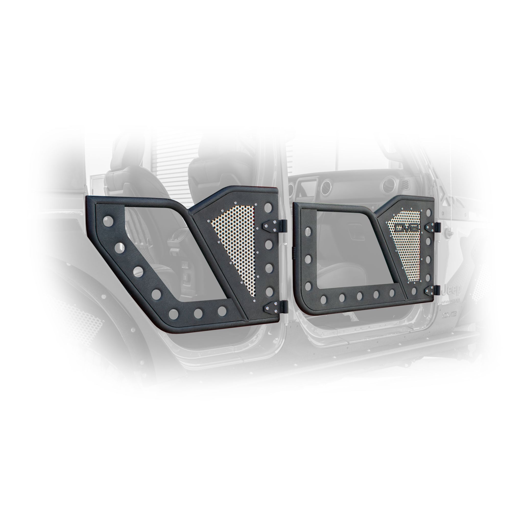 The DV8 Offroad JL Rock Doors provide protection and security while still allowing for an open air doorless experience. These rock doors come with a removeable and paintable aluminum mesh screen and are made of .160 wall tubing and 3/16 in. steel plating.Features: Limit straps to prevent door from swinging too far open, Tubular design for better visibility, Rattle preventing stopper integrated into the design, High quality latches, Simple and easy to install, Aluminum plates can be removed to paint, Comes with a mirror.